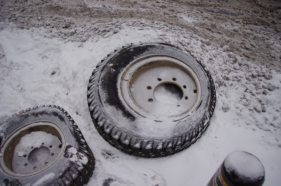 정상의 타이어를...(도로에 눈이 많이 쌓였었죠, 구청입구부근, 인도로 차량이 진입하지 못하도록 설치(?)한 타이어)