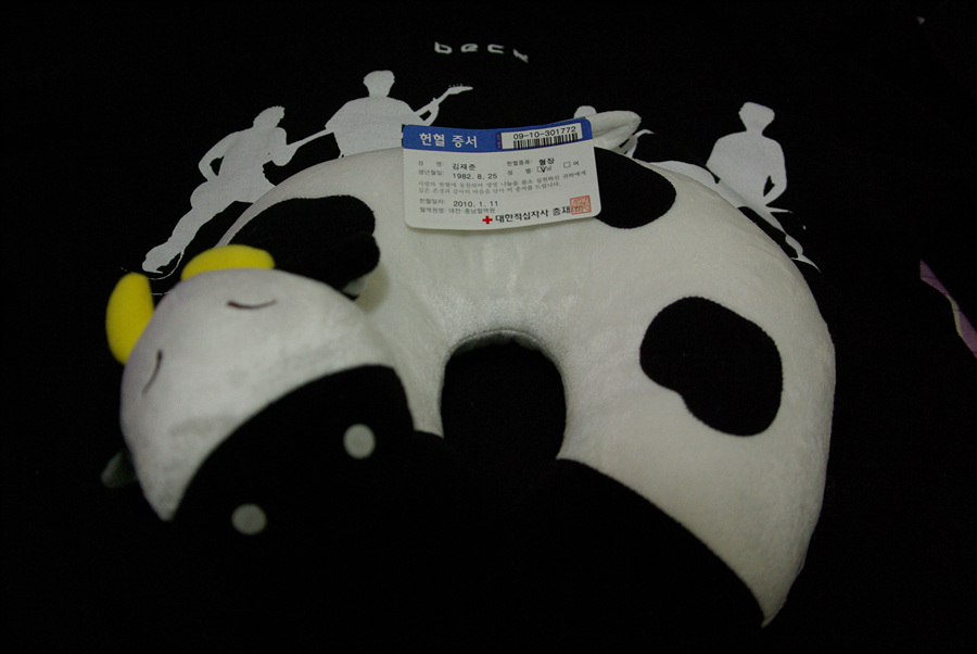 흠...2010년 첫 헌혈했습니다... 올해는 딱히 목표가 없는데...무슨 목표를 만들어야 하나... (작년에 혼자서 약속을 했습니다...한달에 한번 이상 헌혈하기...이뤘구요...ㅎㅎㅎ) 그동안 없었던 목베개를 받았습니다...뻘건 목베개가 있었으면 했는데... 근데...제가 가던 사진관에 스캐너가 고장났답니다...문제네요...고치면 연락 준다는데... 당분간 필름으로 찍은 사진 못 올립니다... 쉬세요...