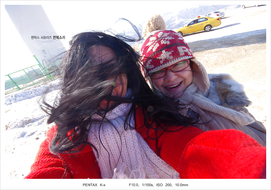 바람이 불어대던 삼양목장 꼭대기에서 바람언니와 셀카 한방!