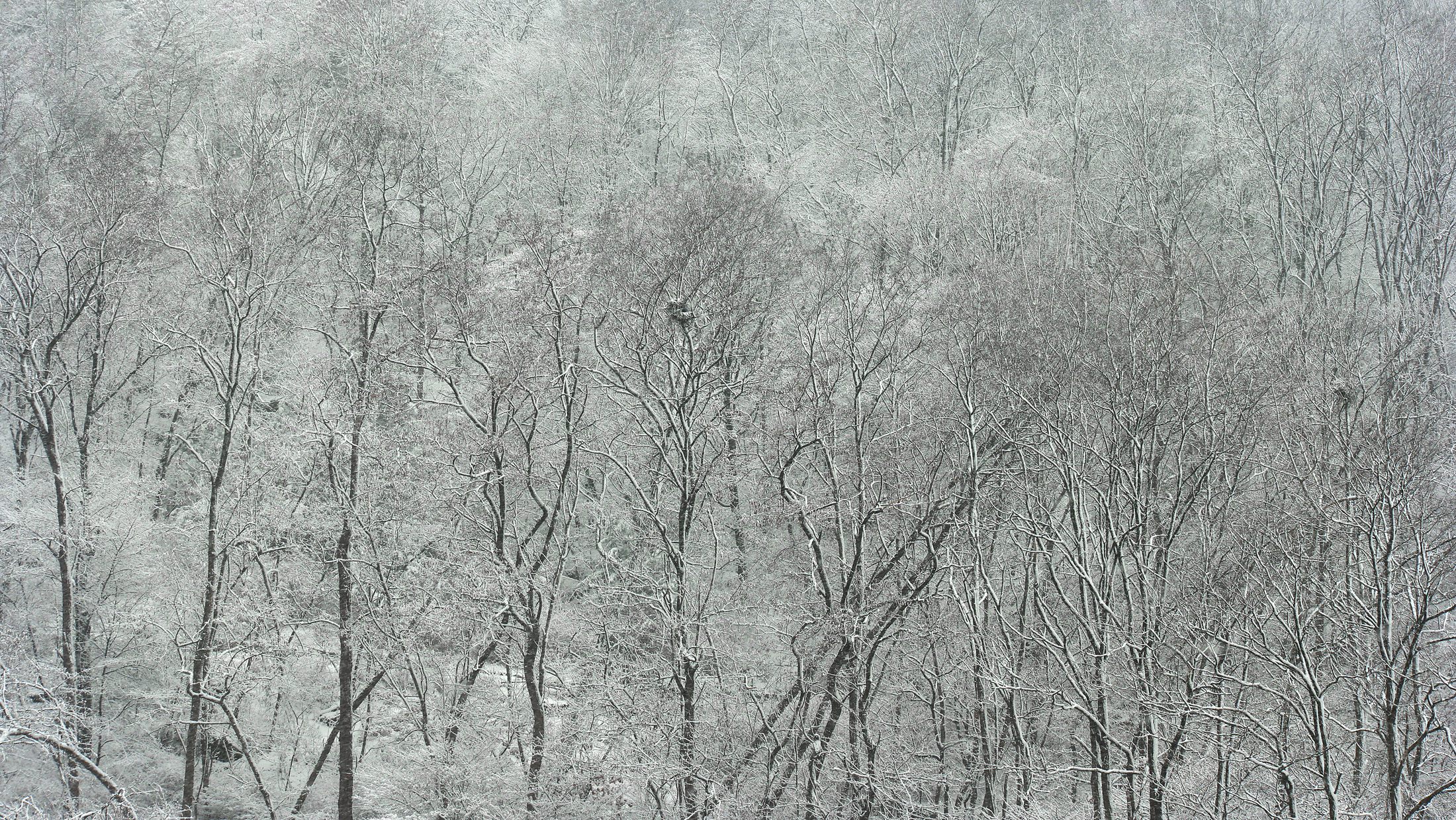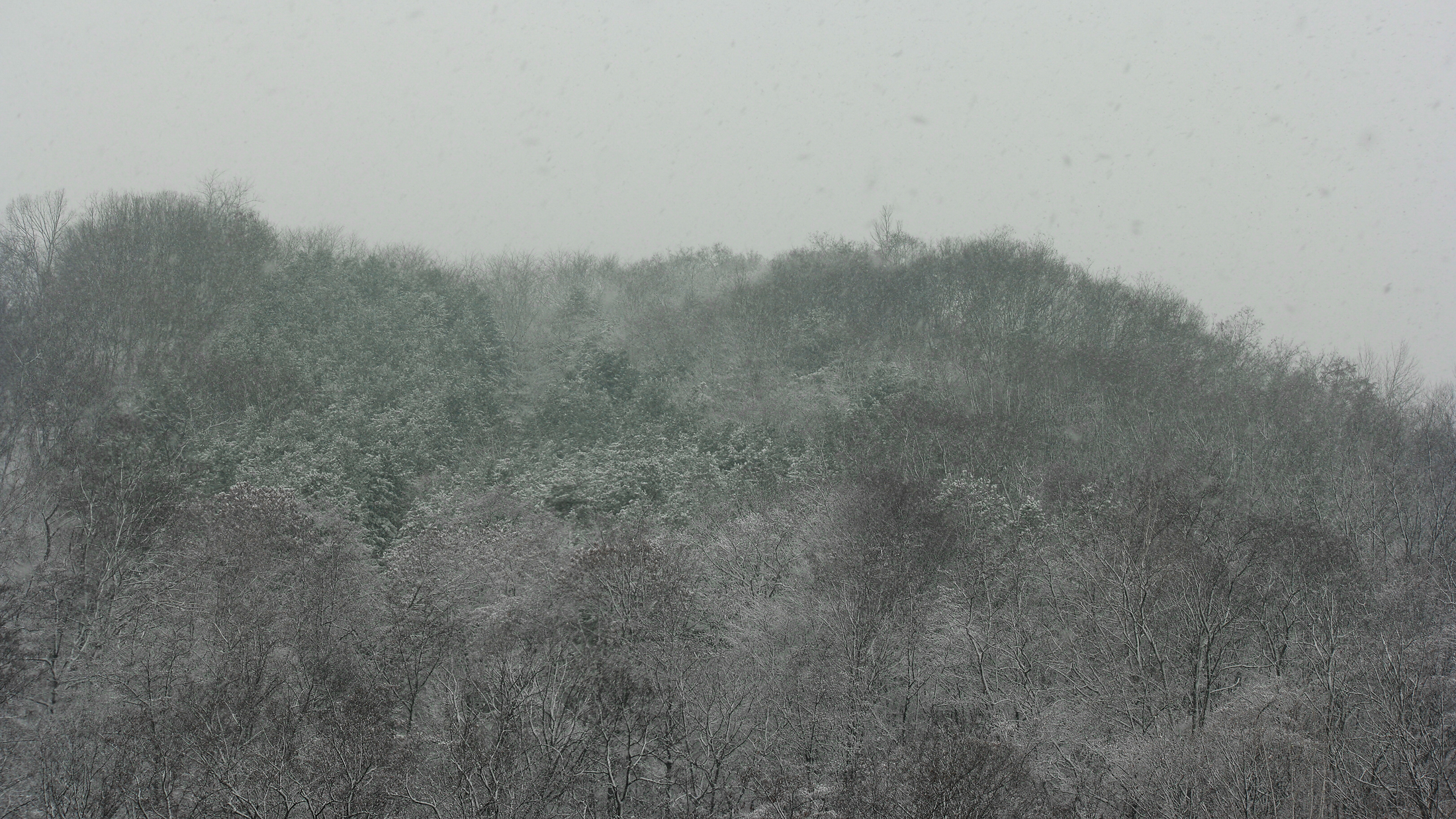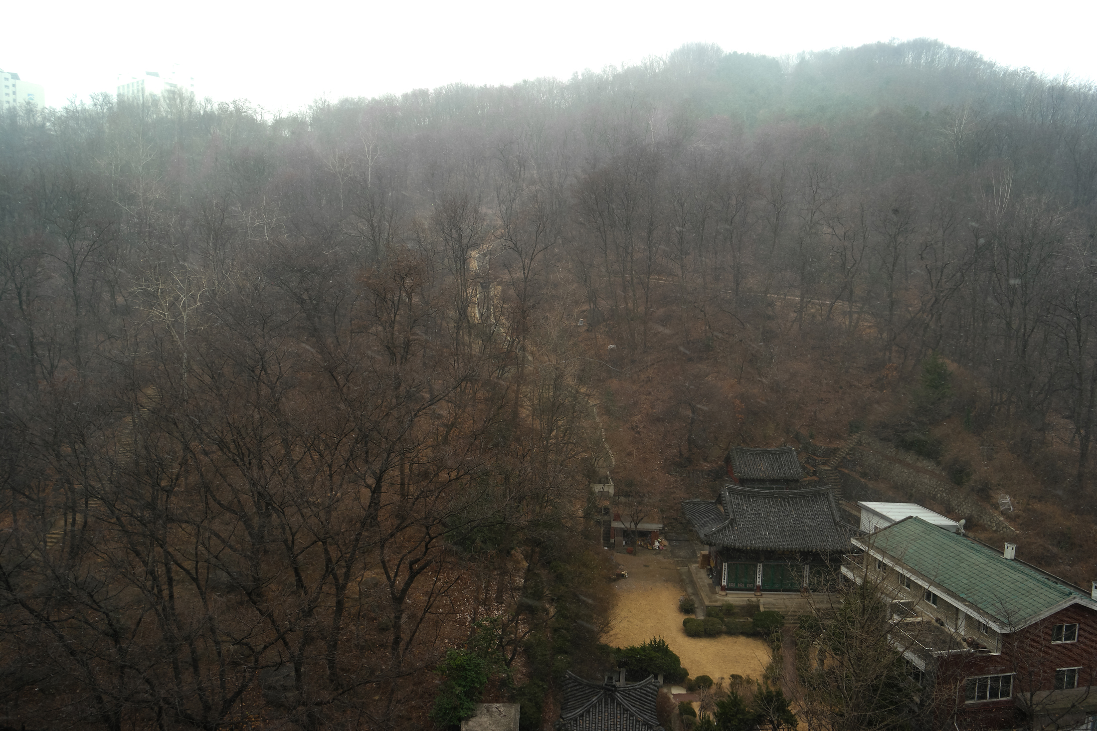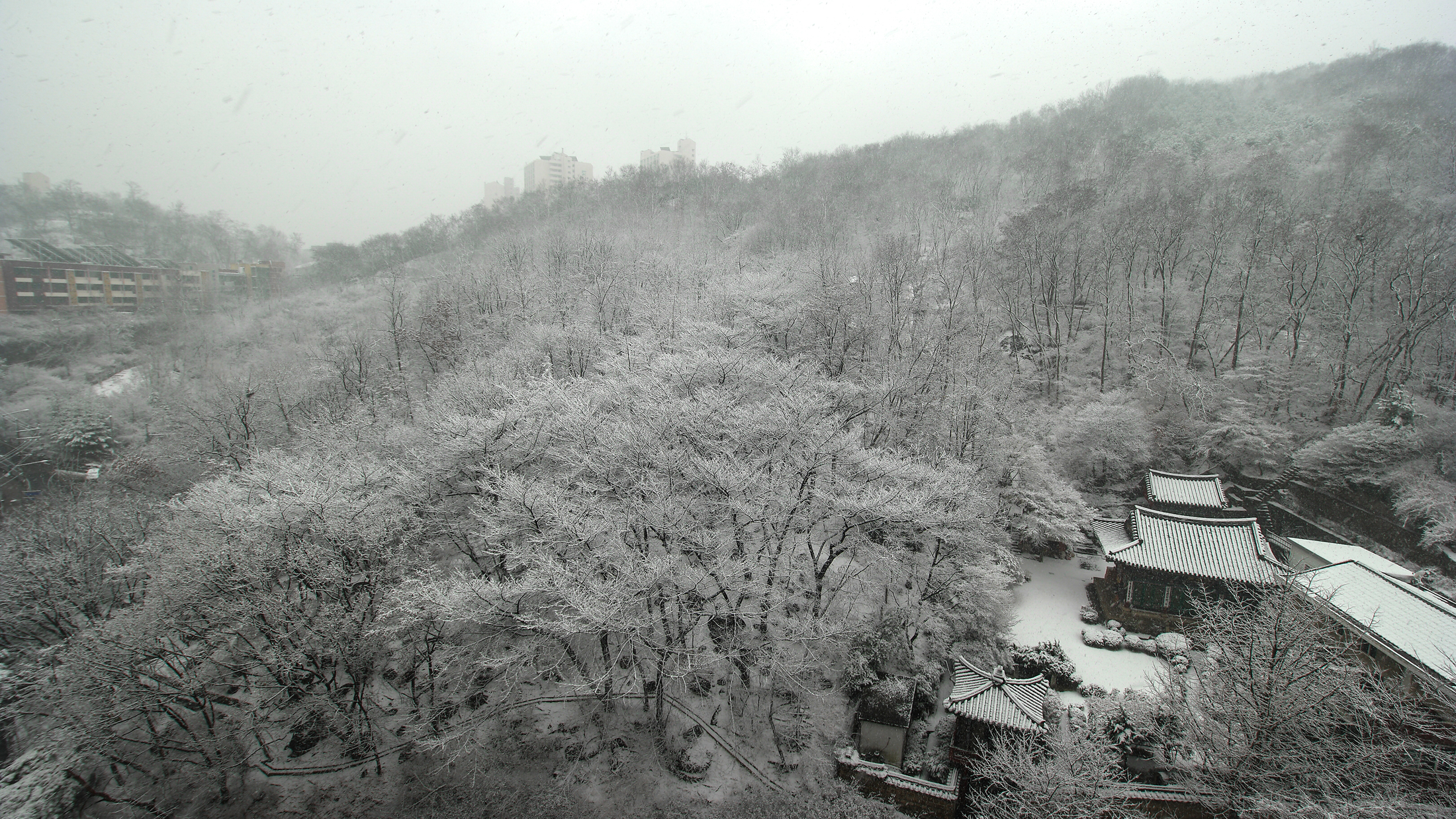 집에서 보이는 암자를 배경으로 눈 내리는 모습을