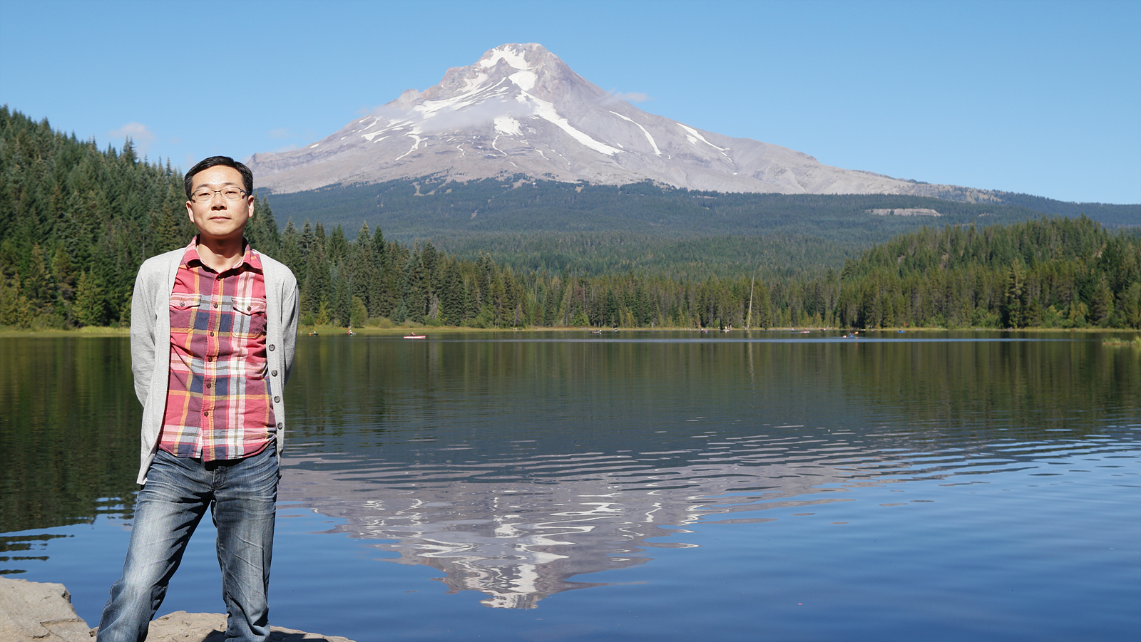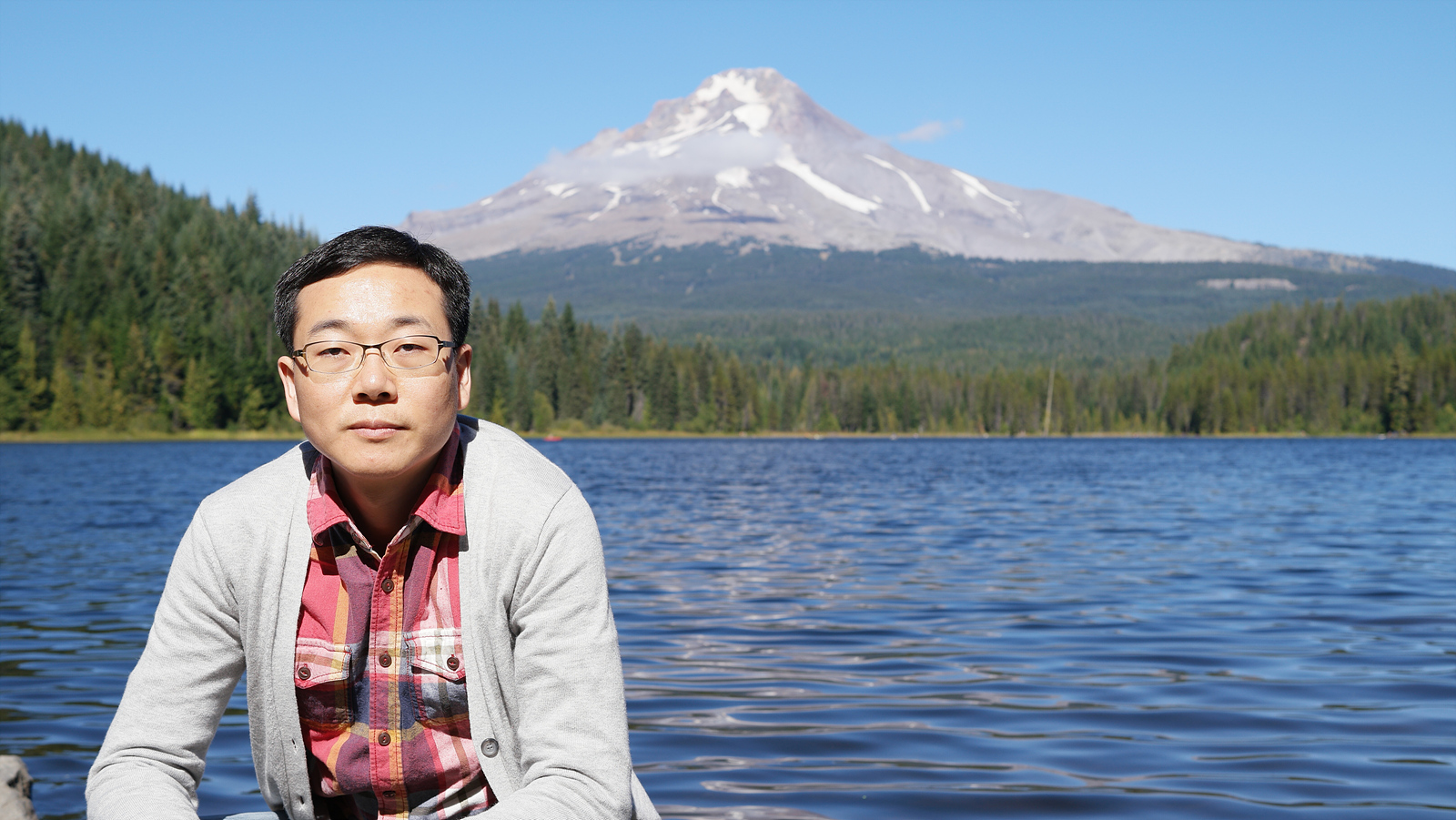마운틴 후드가 보이는 트릴리움 호수에서 셀카 입니다...