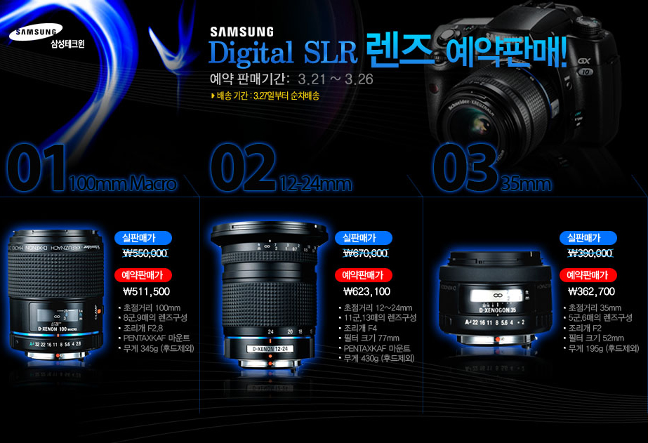 삼성에서 나온다고하던 렌즈가 드디어 예약판매를 하는군여...다른것들도 좀나와주길... 가격이좀내려가주면 더 좋을텐데.....ㅎㅎ