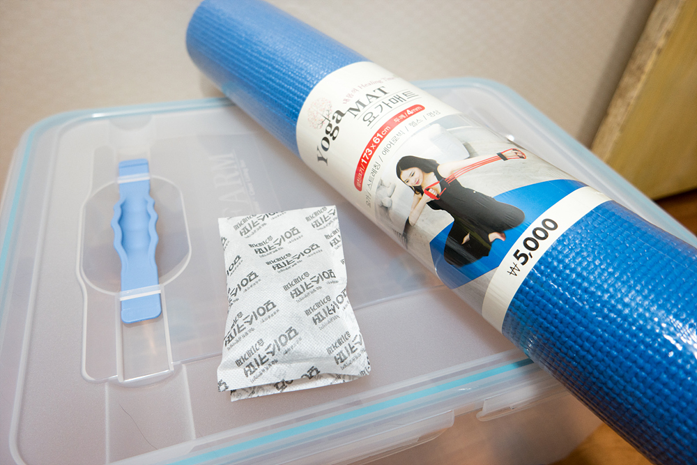 다이소에 가서 실리카겔과 물먹는동물 아무거나... 그리고 요가매트를 하나 사왔습니다.