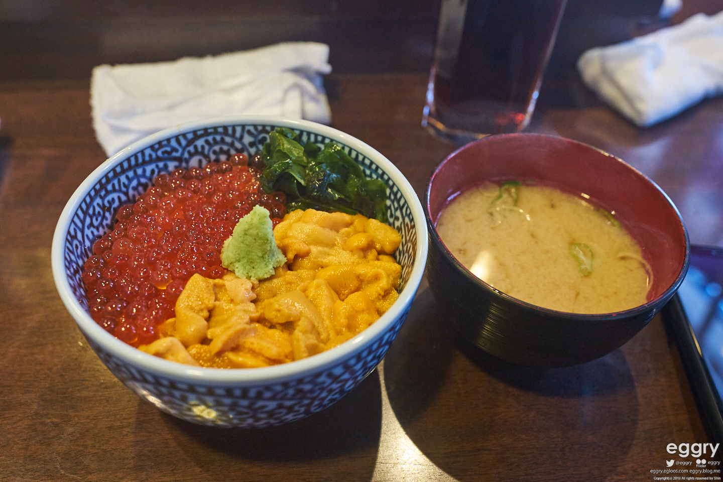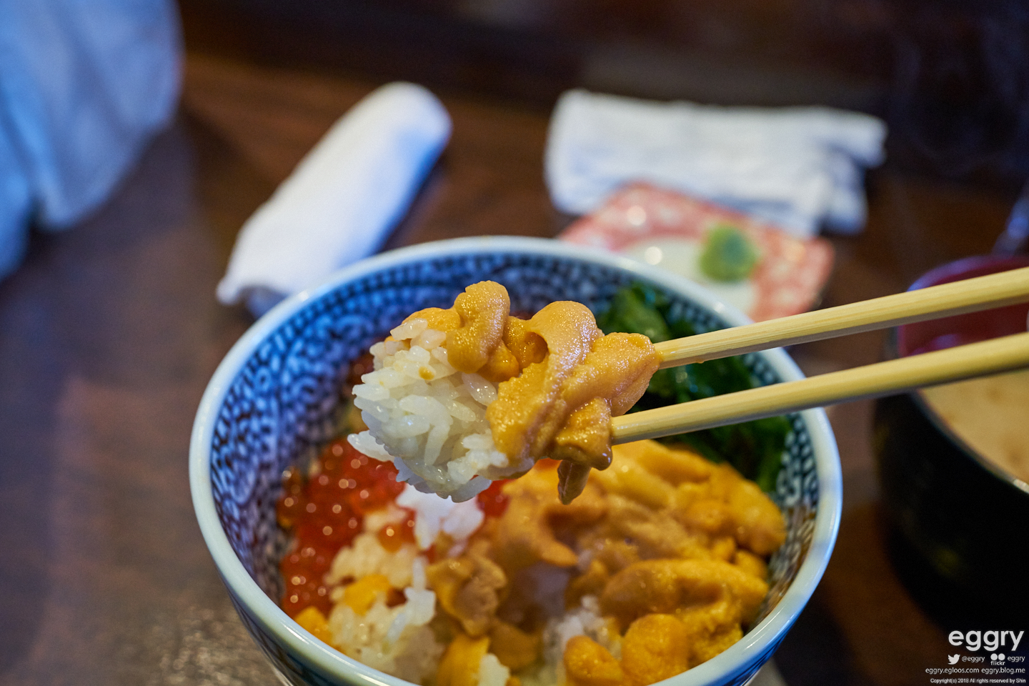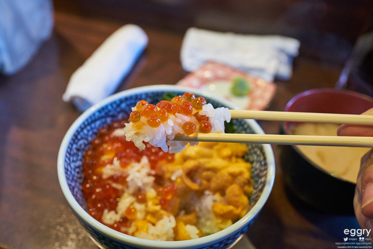 오래 기다려서 해산물 덮밥 집에 들어갔습니다. 연어와 성게알 덮밥. 성게알은 몇번 먹어봤는데 제 입맛엔 안 맞는 거 같습니다.
