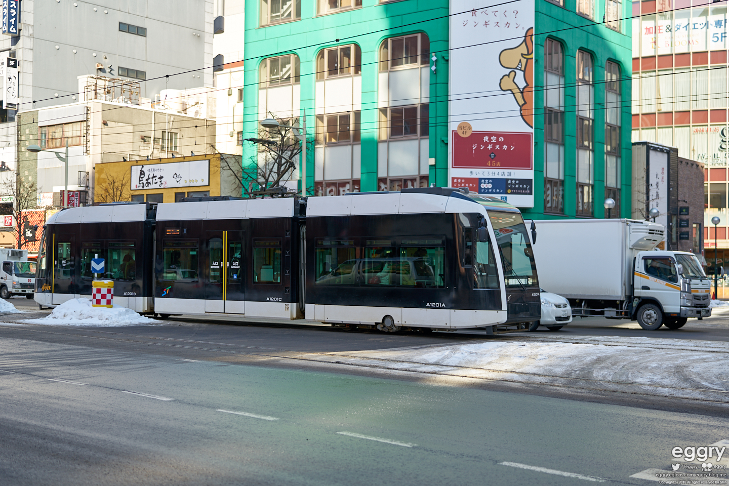 완전 신형의 미끈한 노면전차와 조금 된 노면전차. 클래식 수준은 아니지만요.