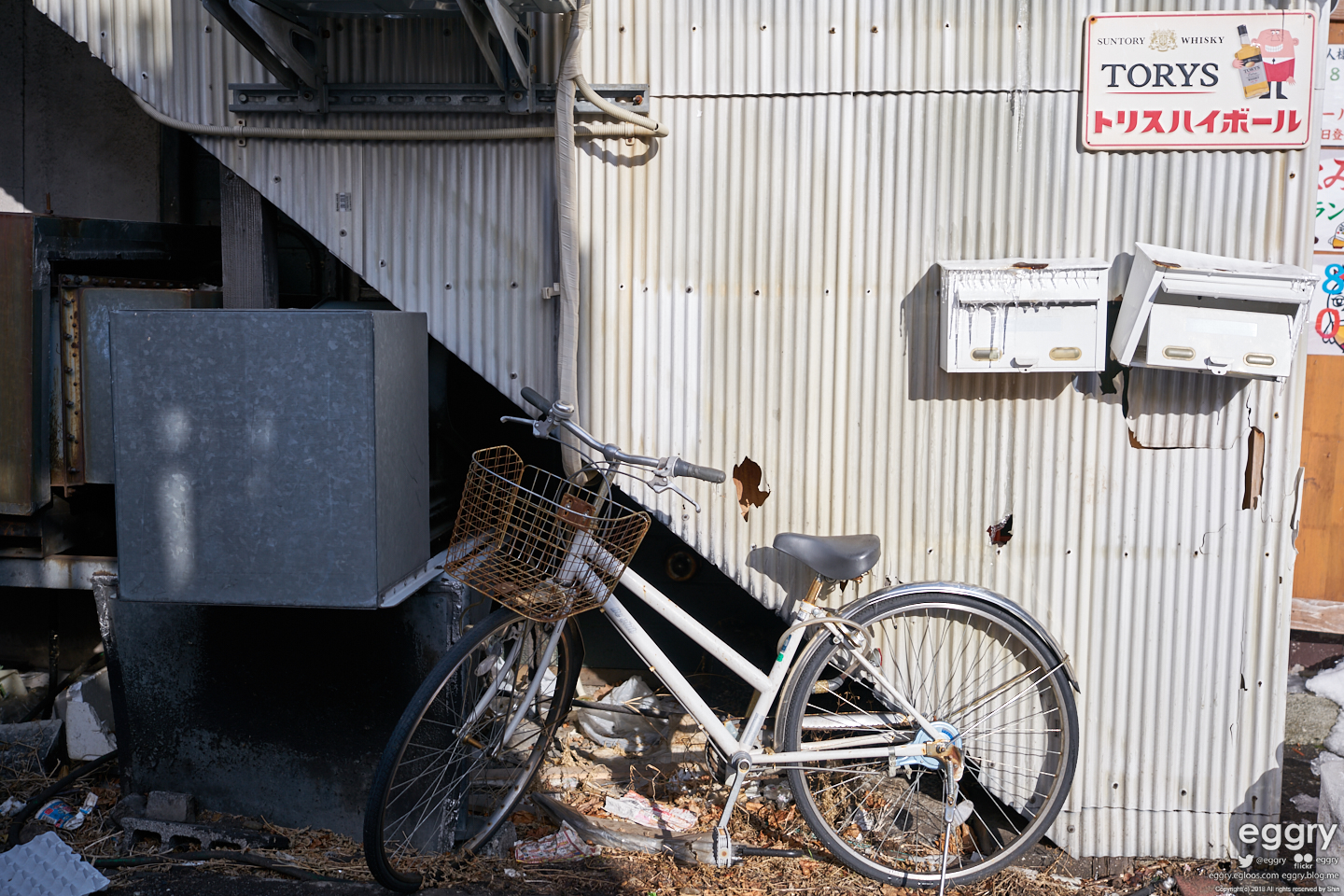 녹슨 가게 뒷골목과 자전거.