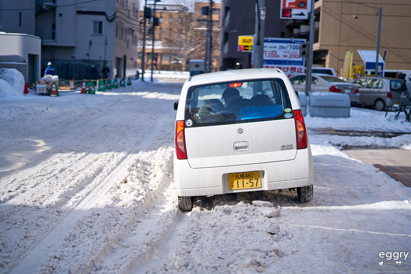 눈 가득한 길을 힘겹게 가는 경차