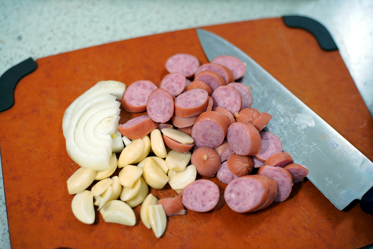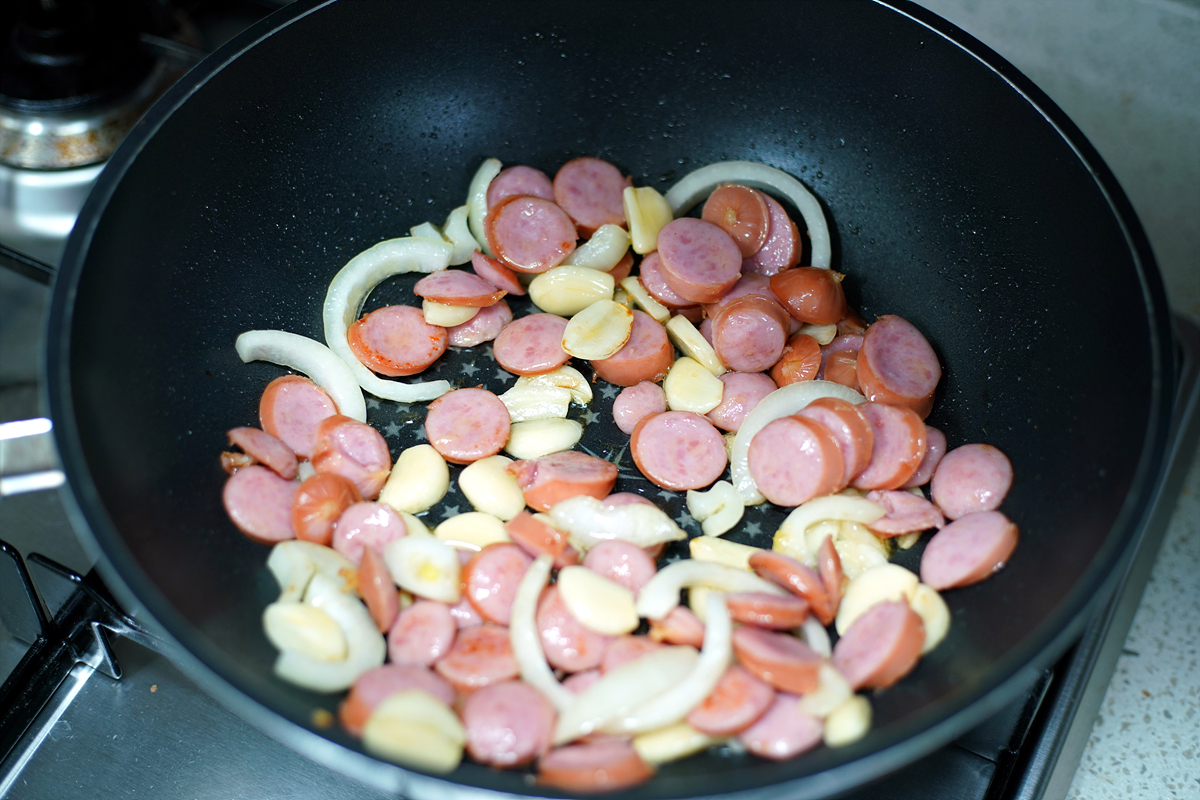 달궈진 팬에 올리브유를 두르고 부재료인 마늘, 양파, 햄을 볶아줍니다.