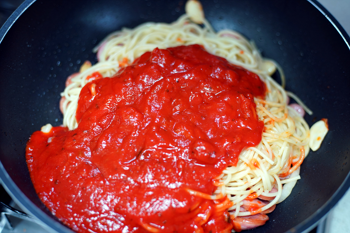 메인 재료인 스파게티 면과 스파게티 소스입니다.