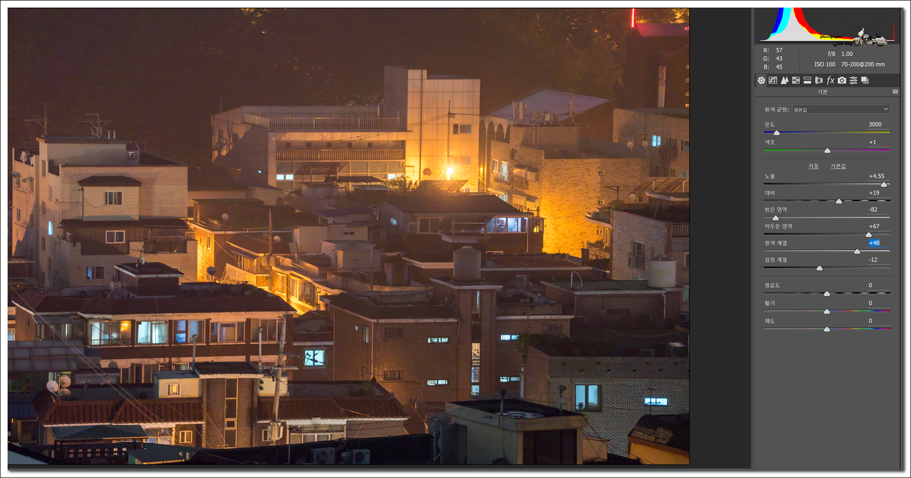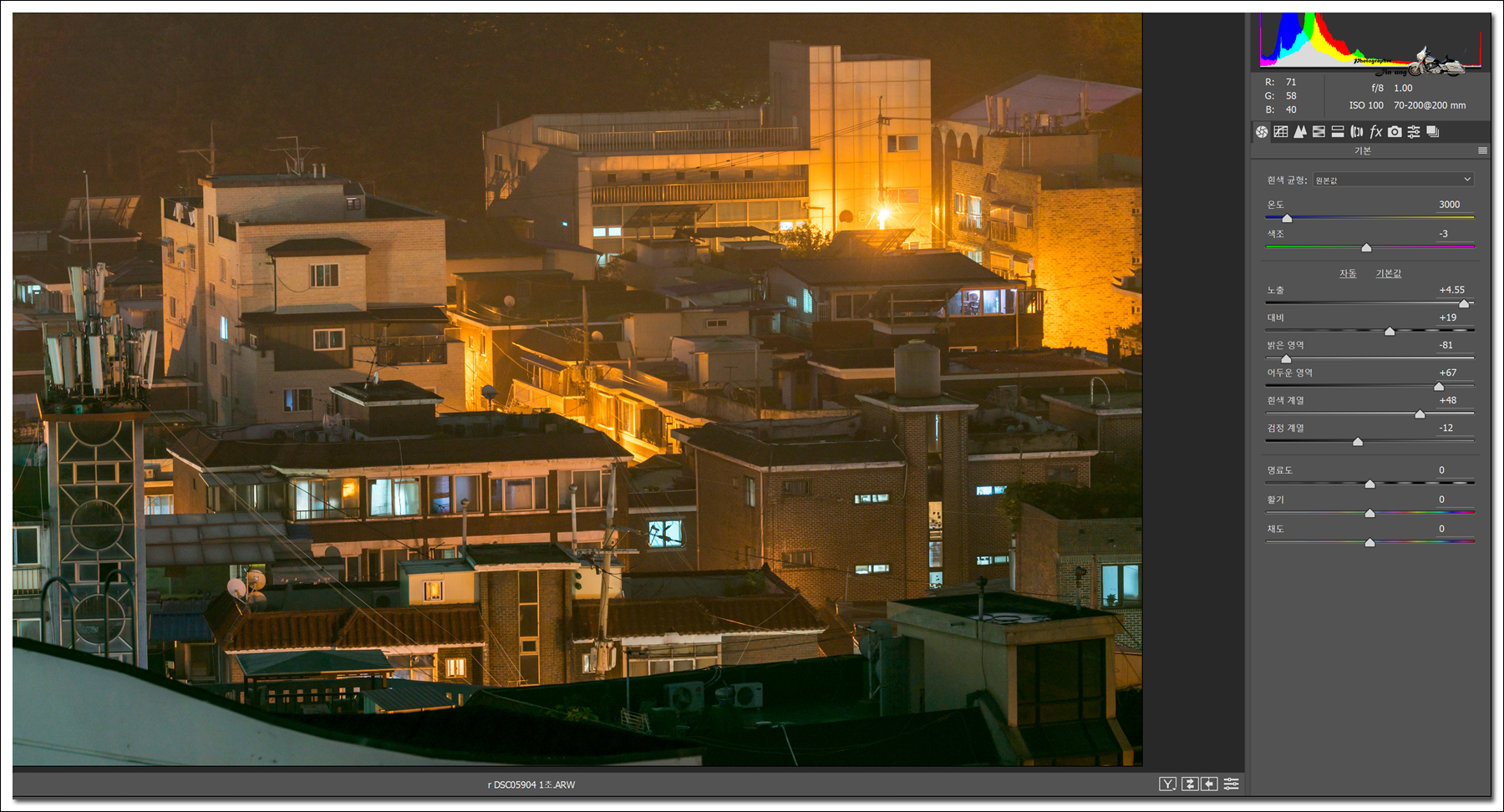 1초 노광 raw파일 포토샵 노출 보정 장면.-- 이후 모든 사진은 색온도와 색조를 동일하게 조정하고 노이즈와 샤픈은 0로.