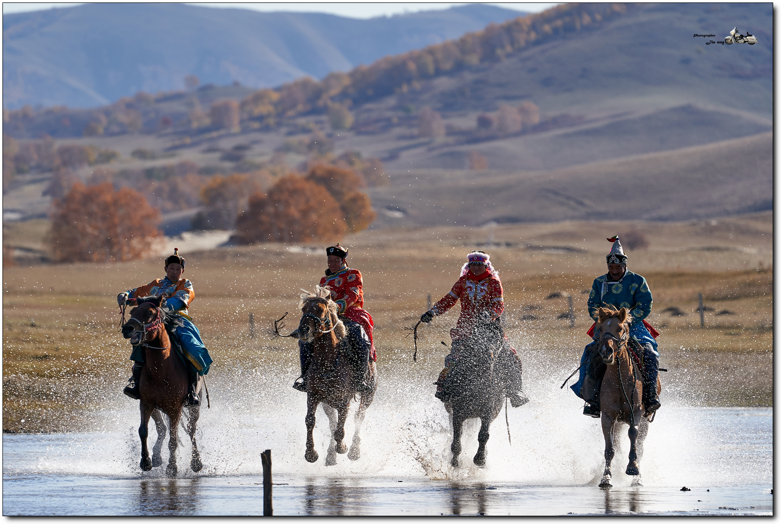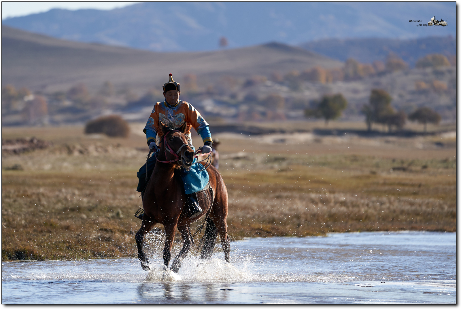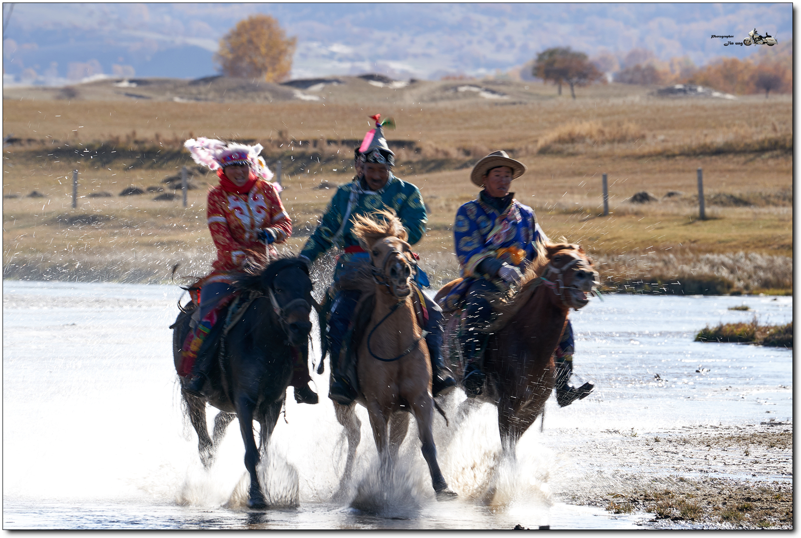 사진속 흰색 머리 장식에 빨간 의상은 여성 기수.