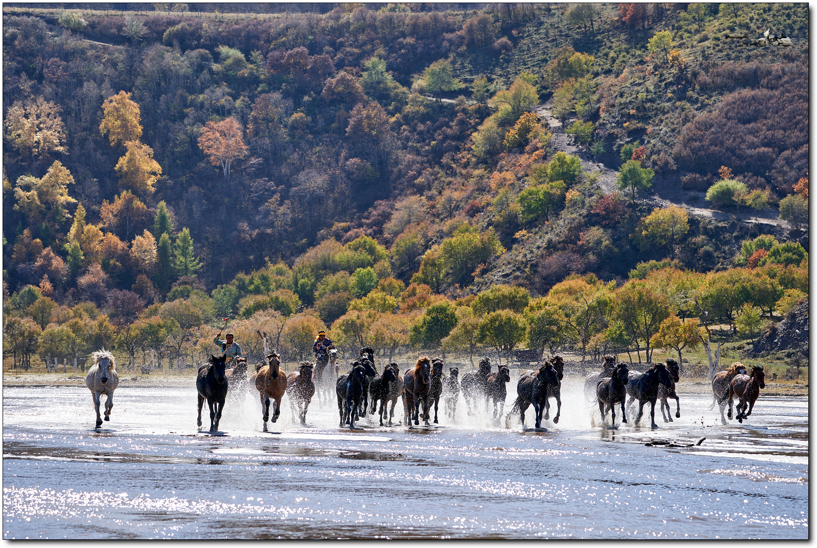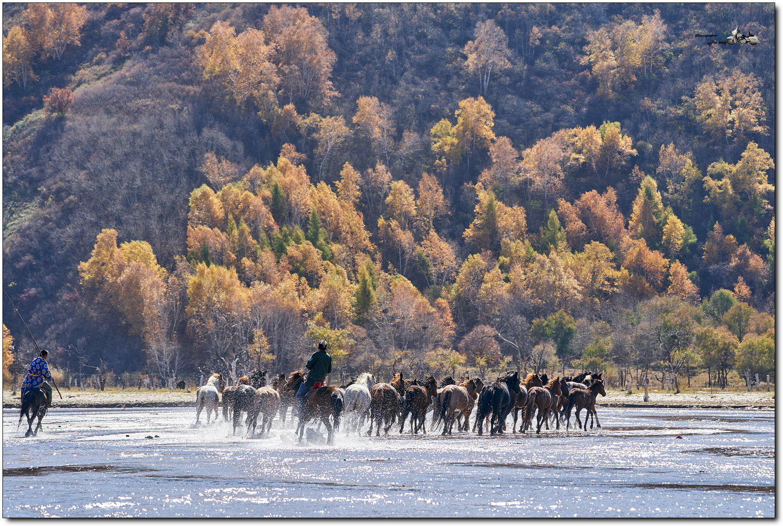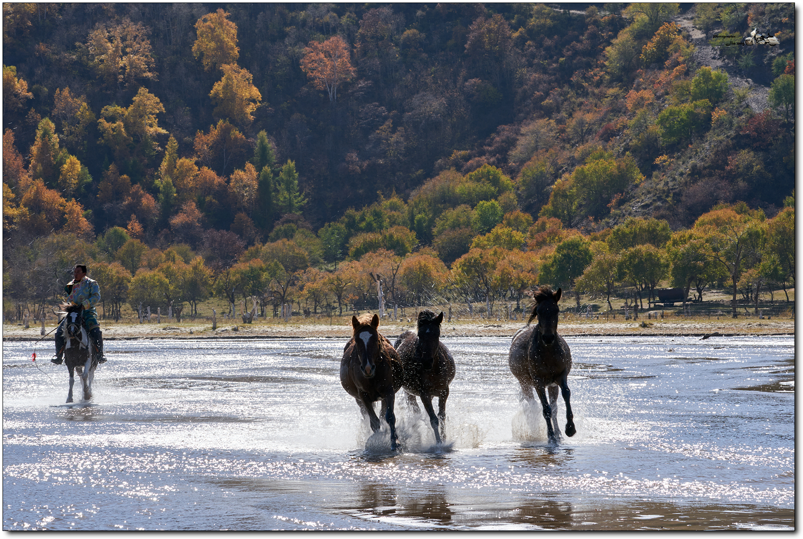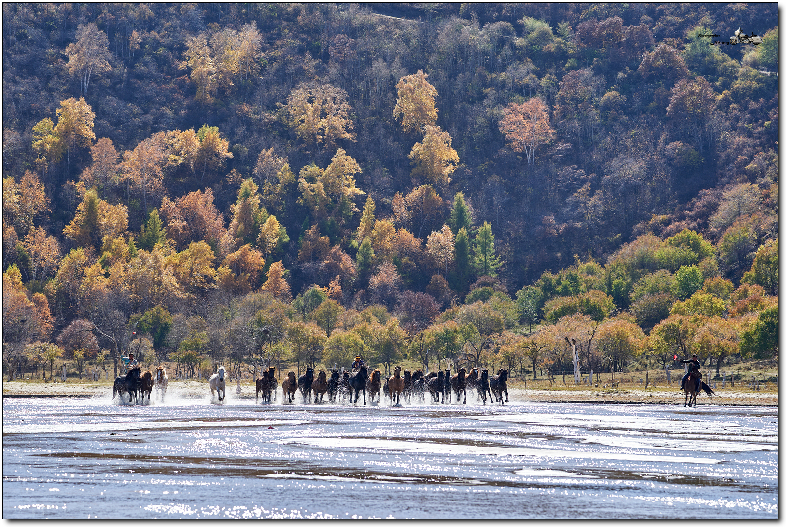 저 멀리 언덕의 자작나무등 단풍이 역광에 빛나고, 말발굽 아래 부서지는 햇빛이 찬란합니다.