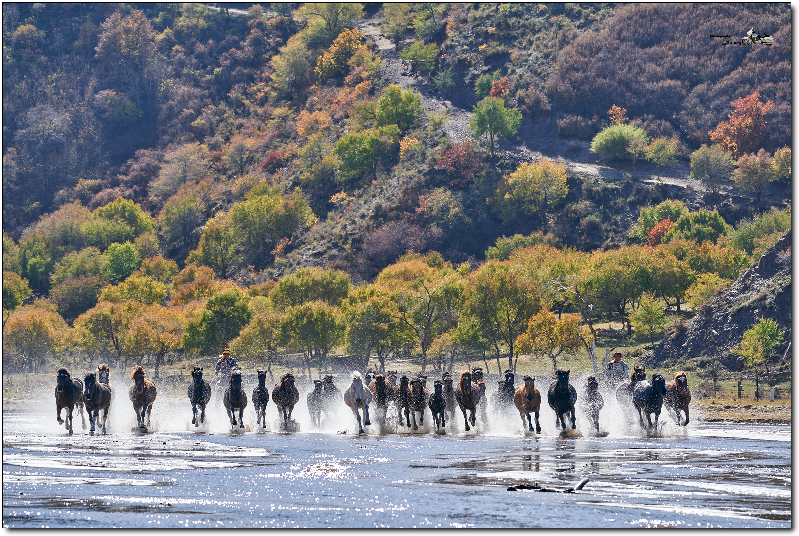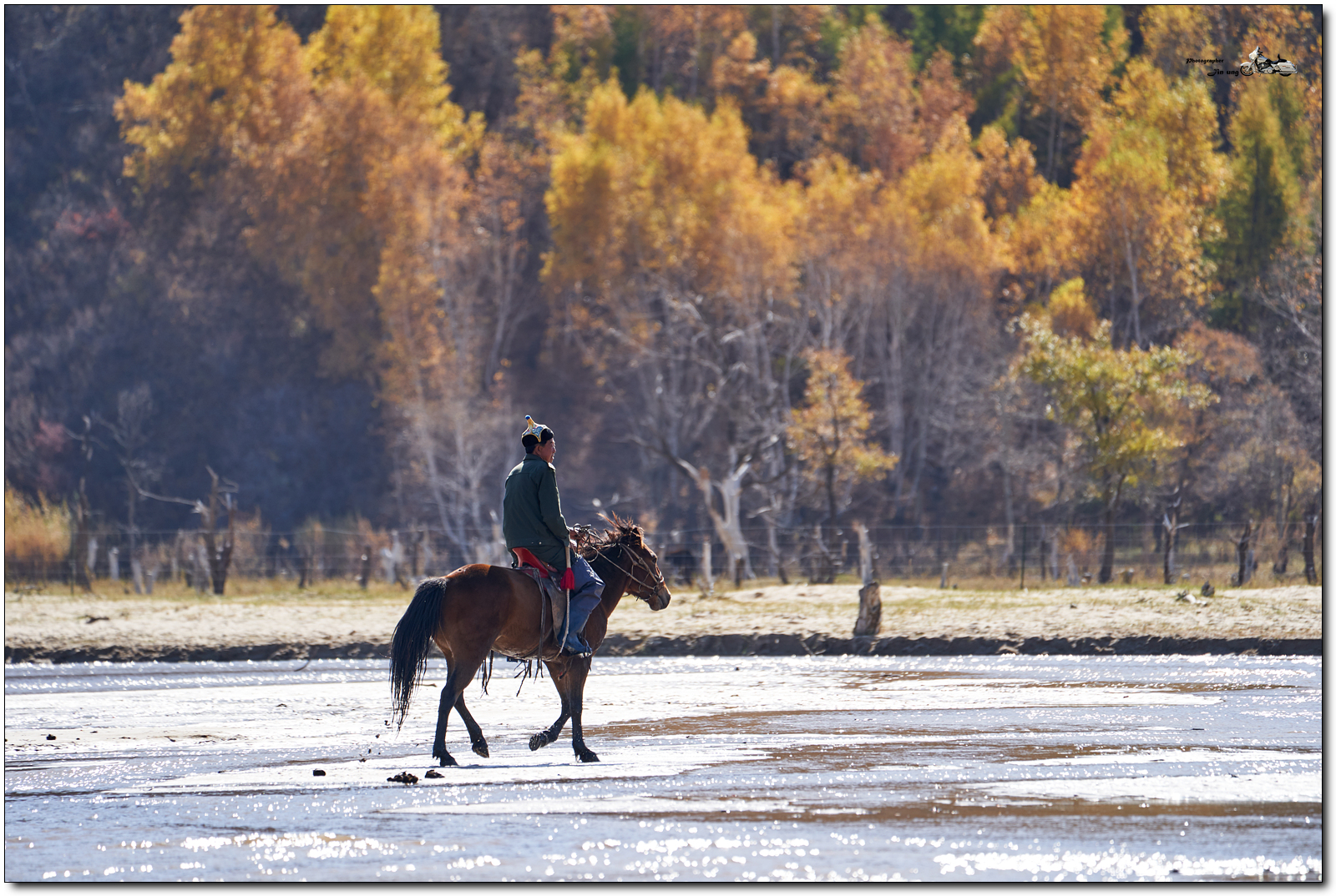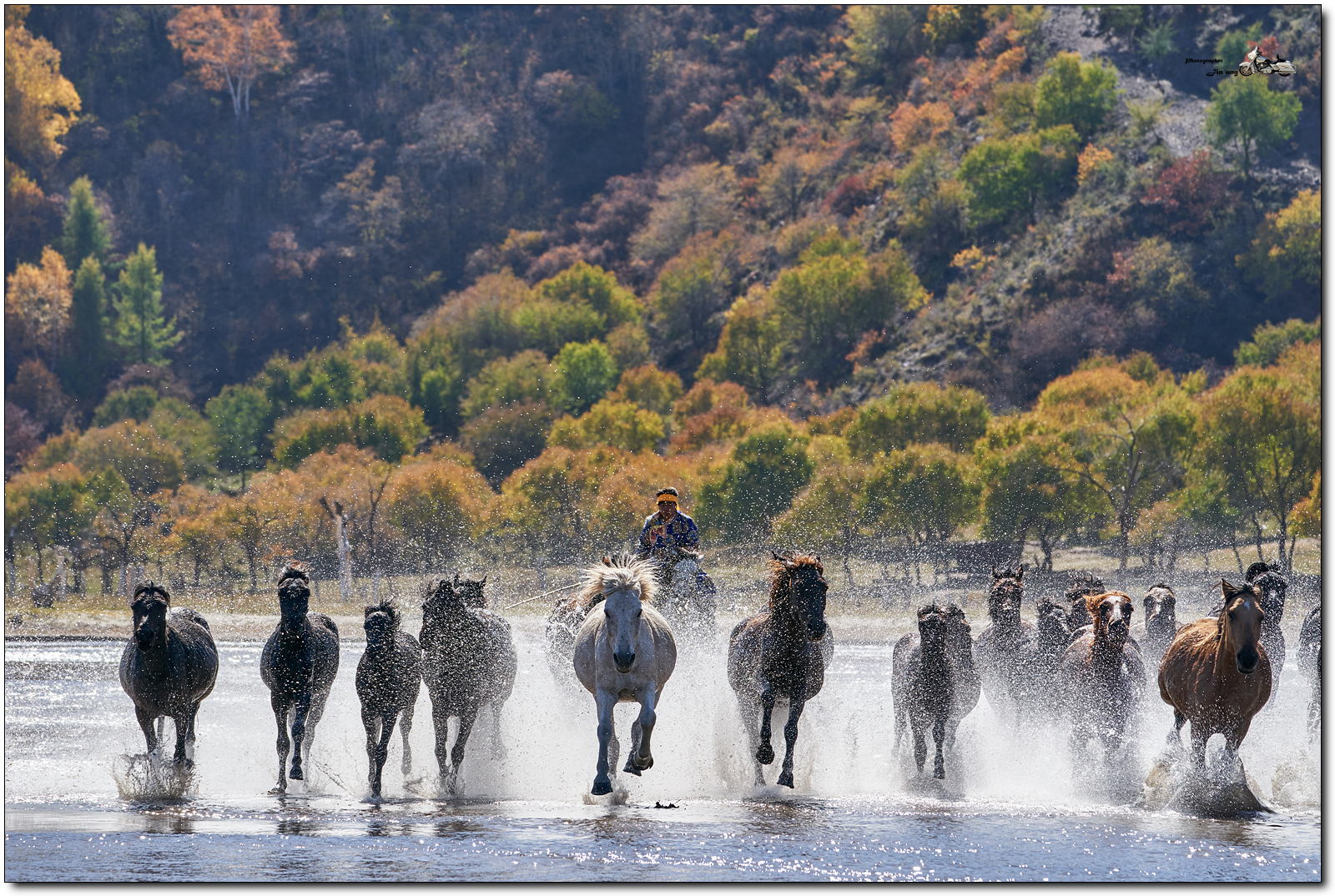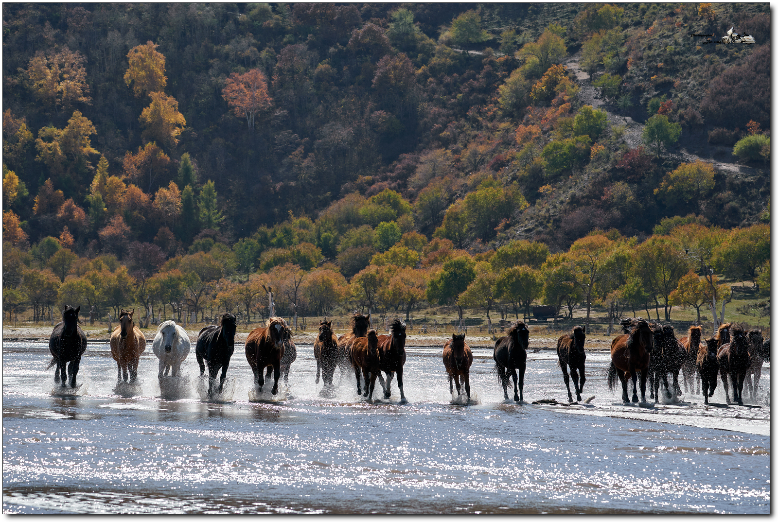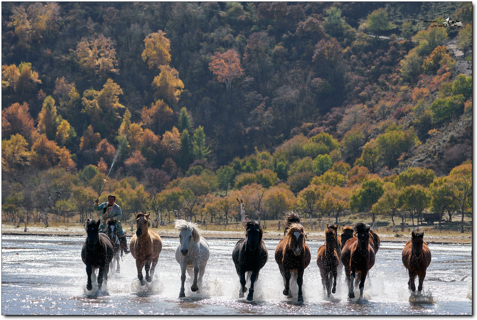 저 멀리 언덕의 자작나무등 단풍이 역광에 빛나고, 말발굽 아래 부서지는 햇빛이 찬란합니다.