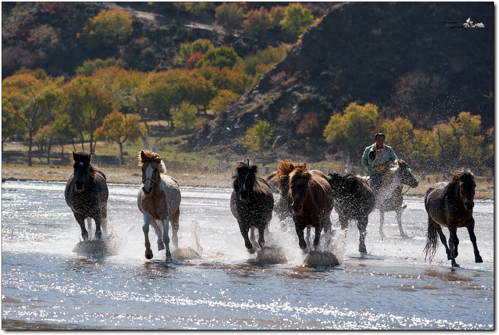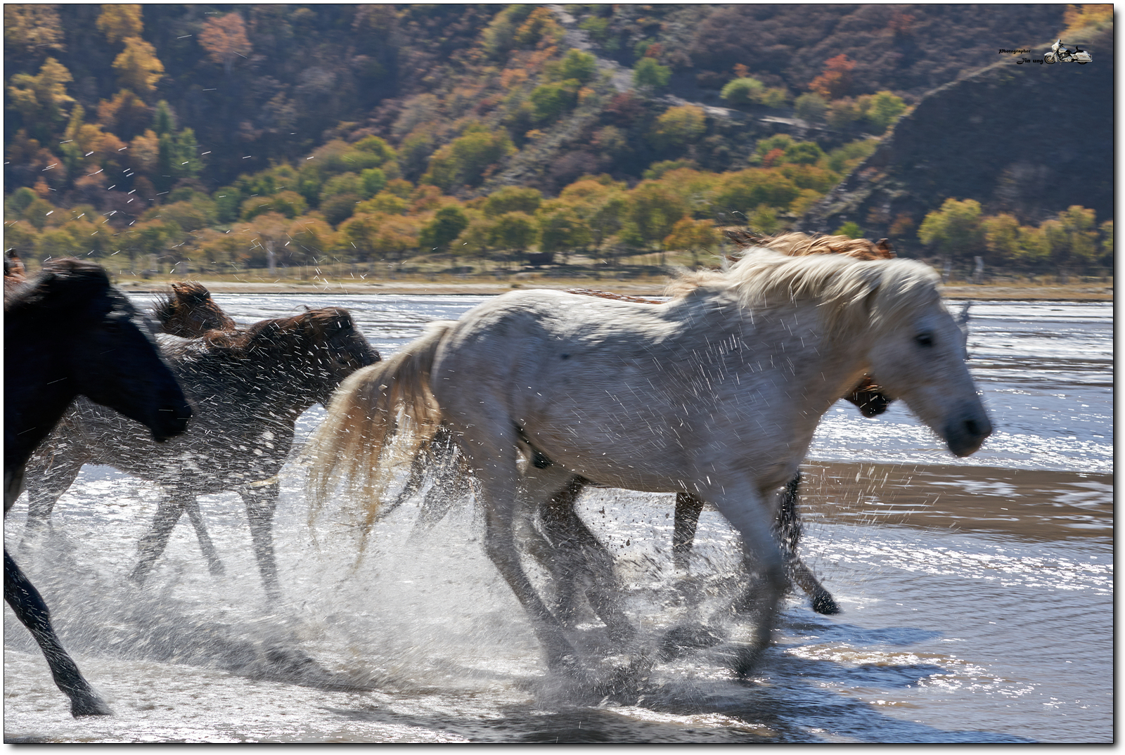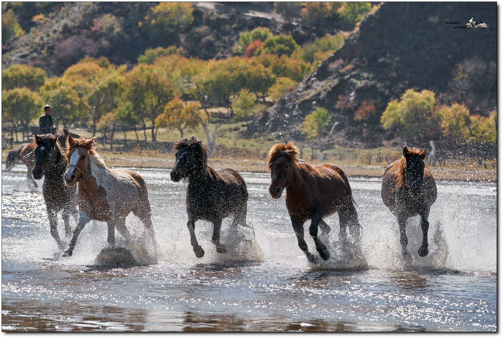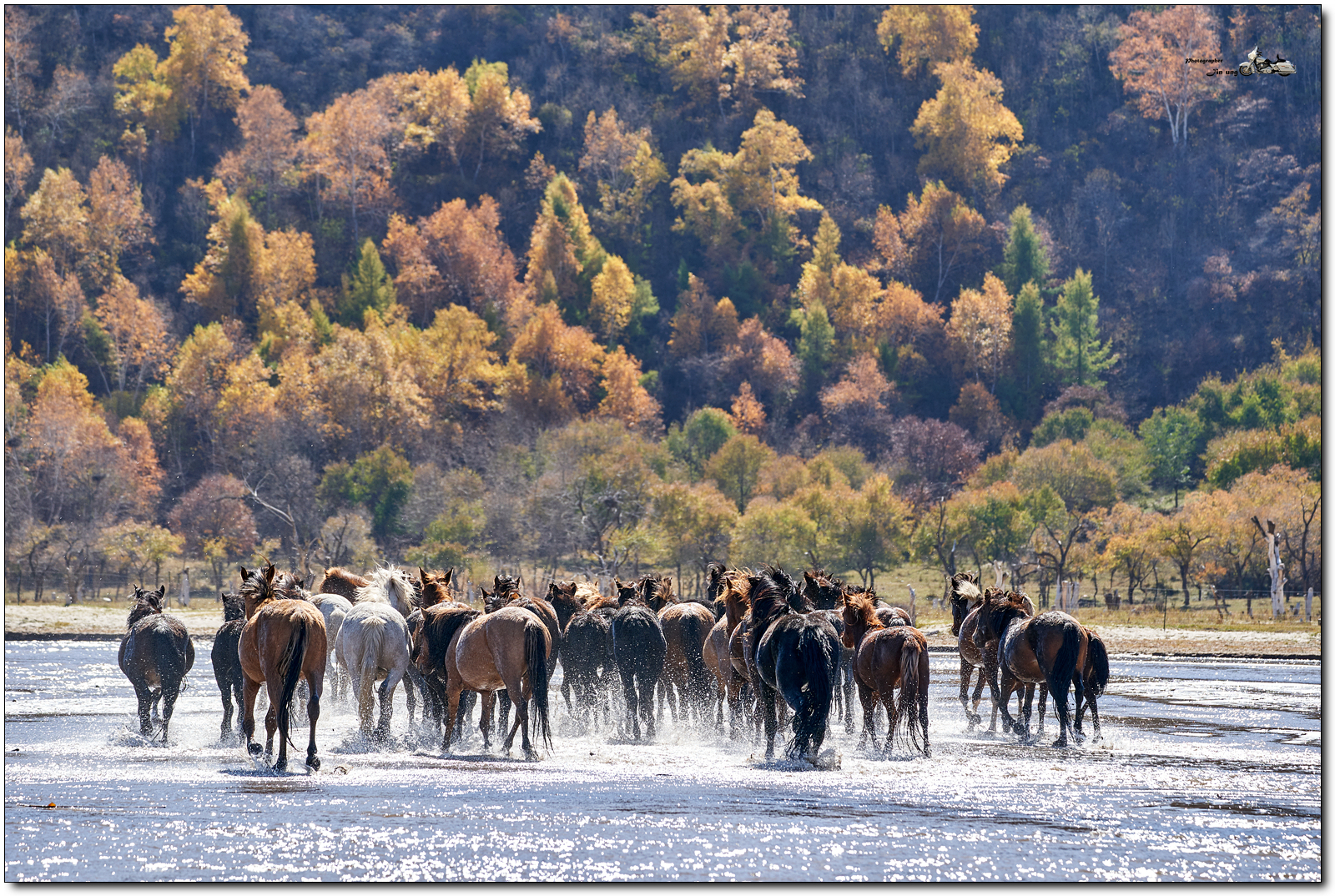 저 멀리 언덕의 자작나무등 단풍이 역광에 빛나고, 말발굽 아래 부서지는 햇빛이 찬란합니다.