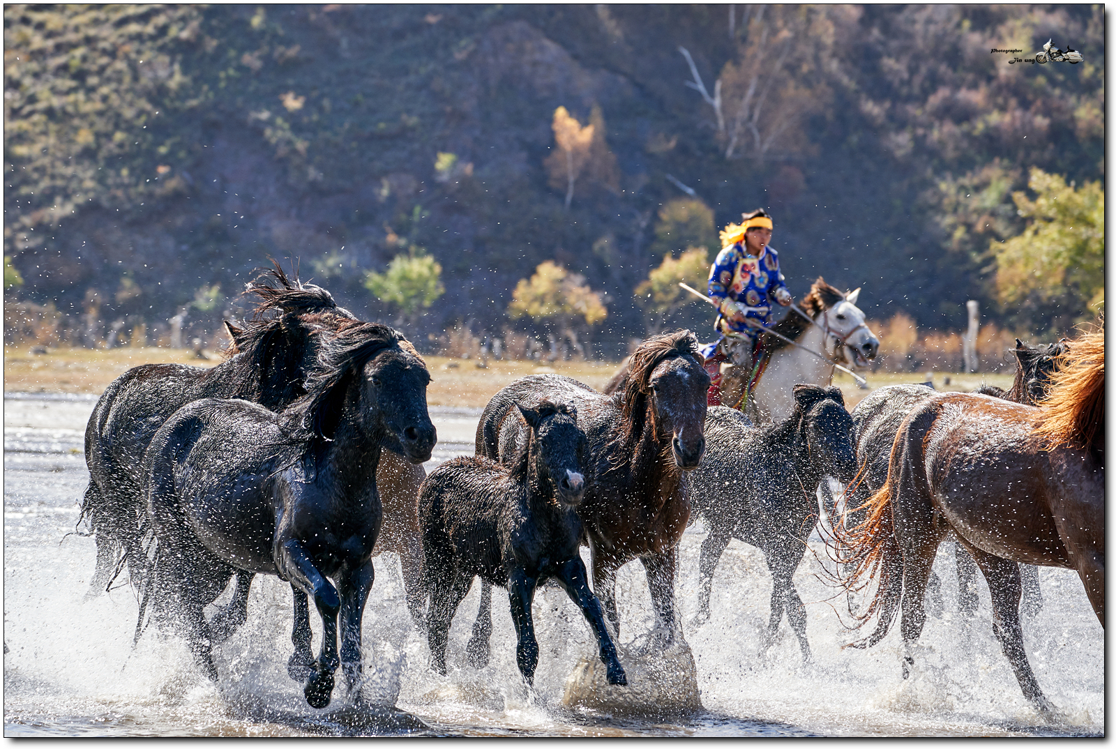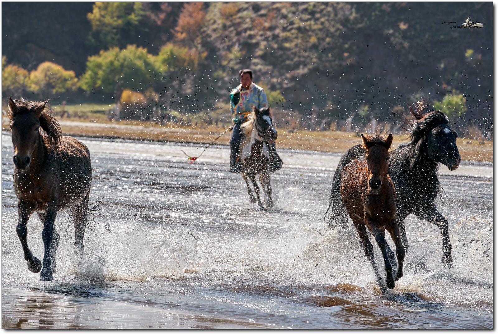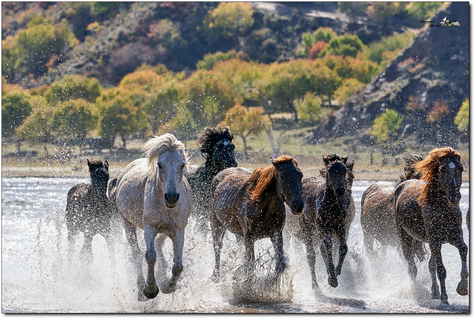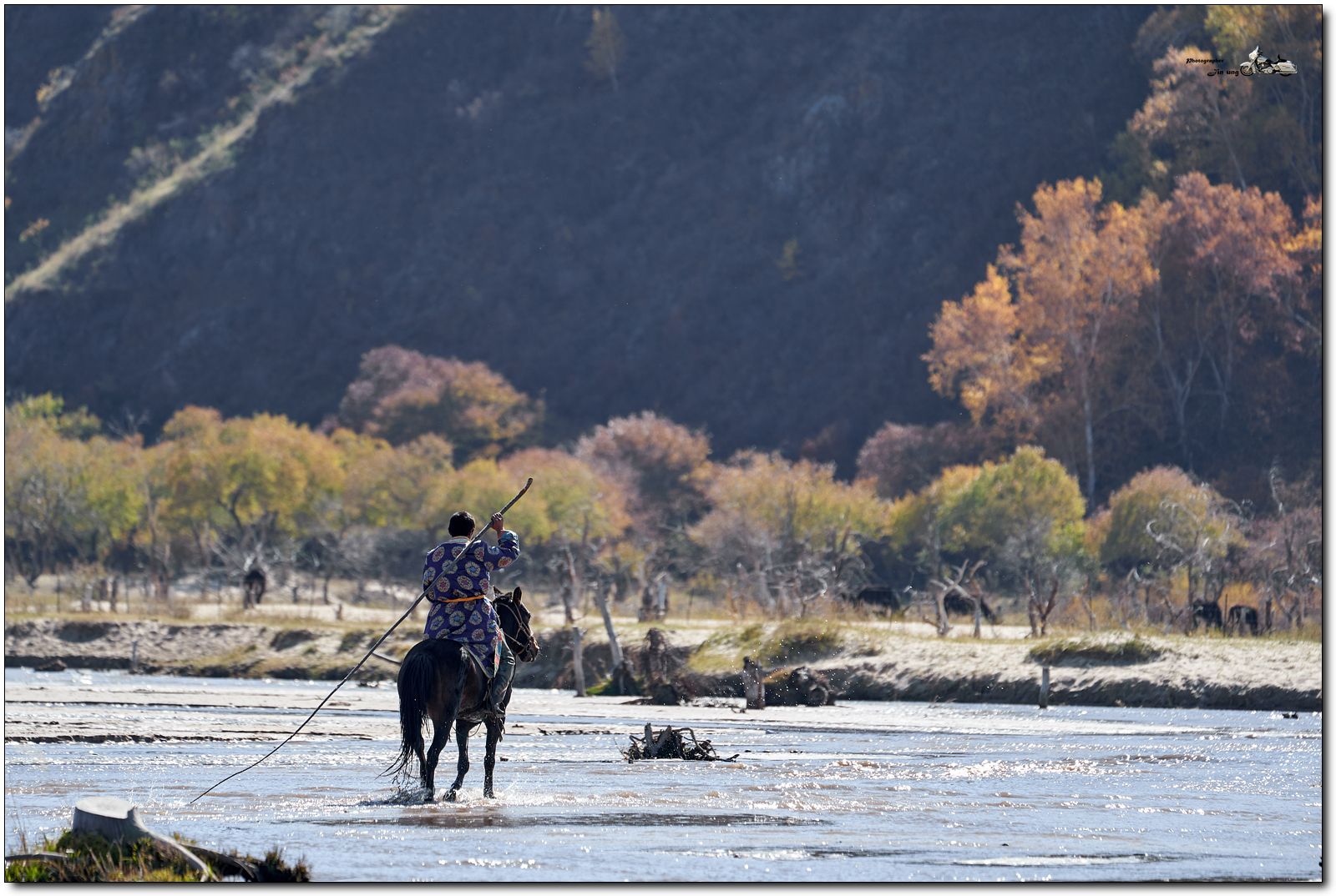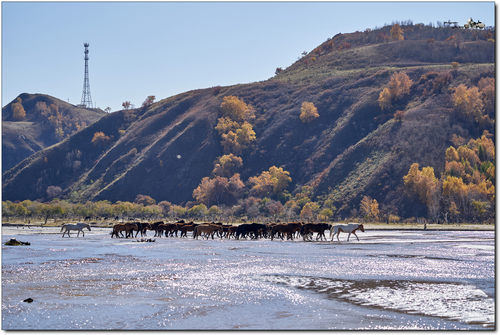 저 멀리 언덕의 자작나무등 단풍이 역광에 빛나고, 말발굽 아래 부서지는 햇빛이 찬란합니다.