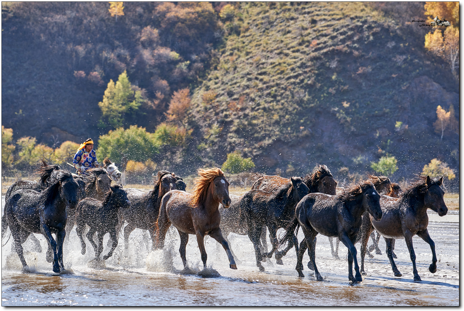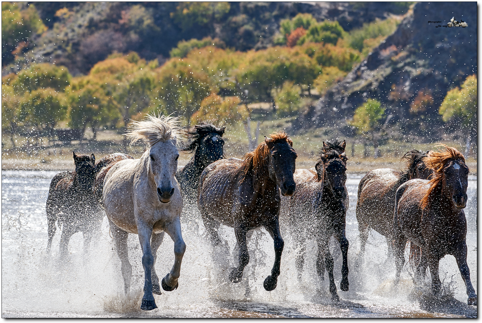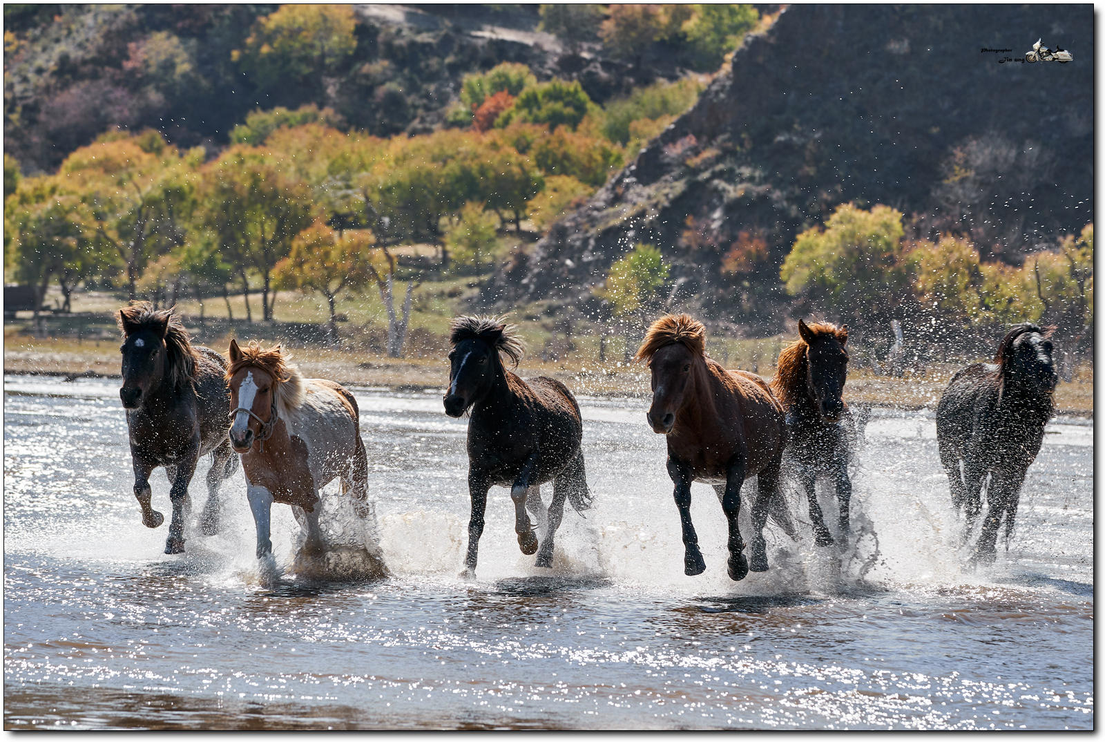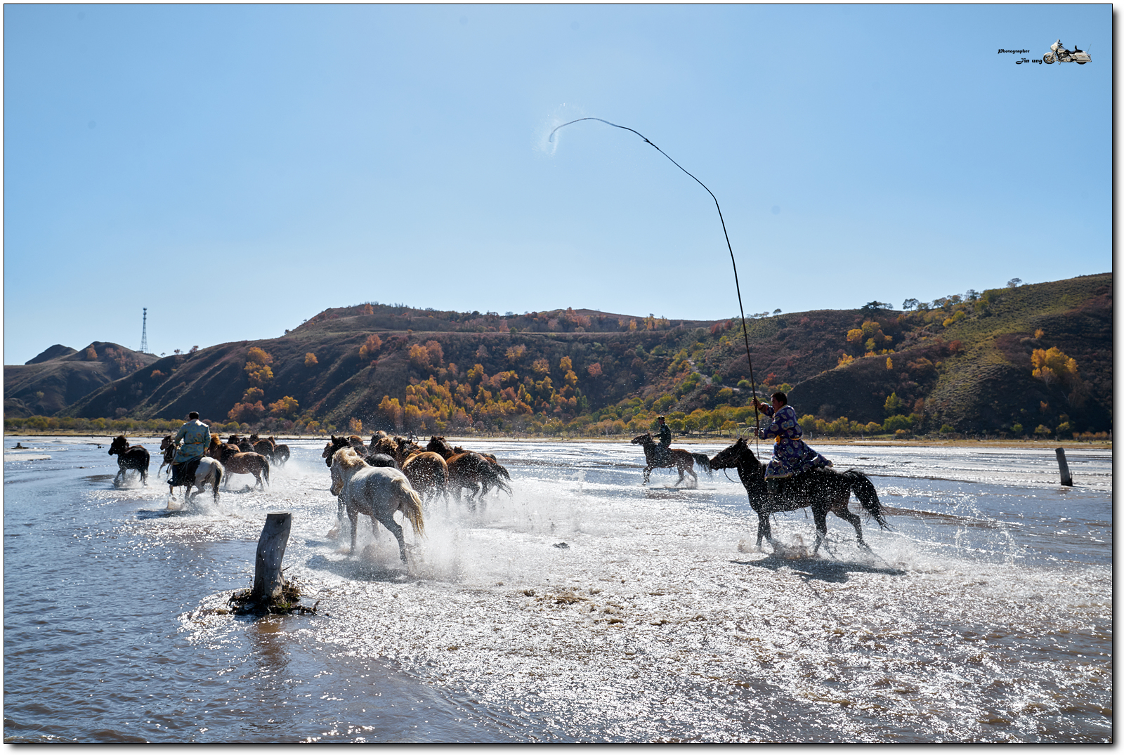 저 멀리 언덕의 자작나무등 단풍이 역광에 빛나고, 말발굽 아래 부서지는 햇빛이 찬란합니다.