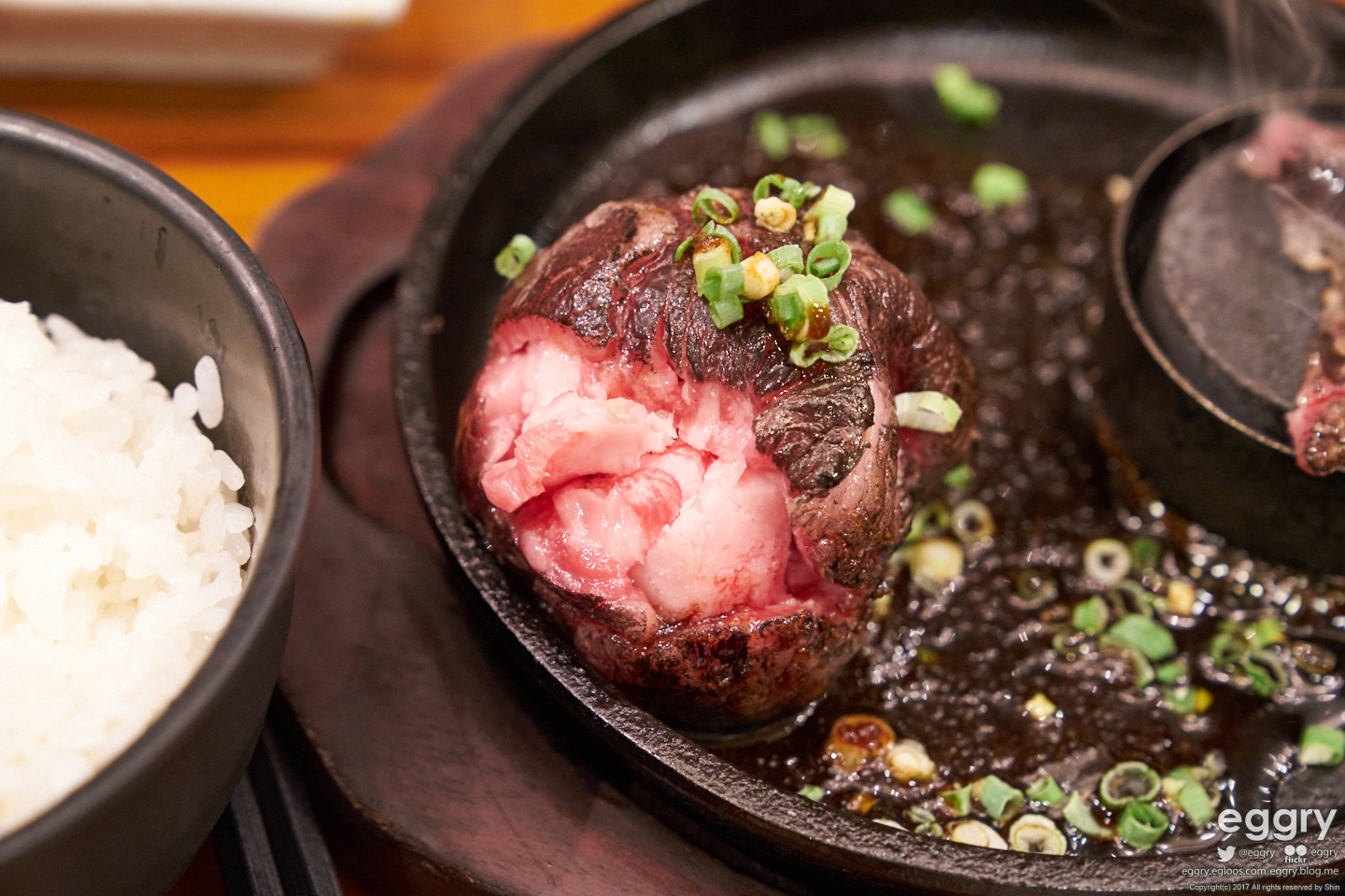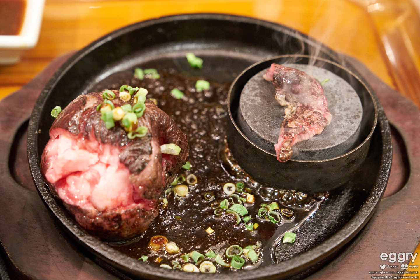 햄버그는 말 그대로 다진 고기지만 이쪽은 야키니쿠용 썰은 고기를 뭉쳐놓은 걸 직접 구워서 먹습니다.
