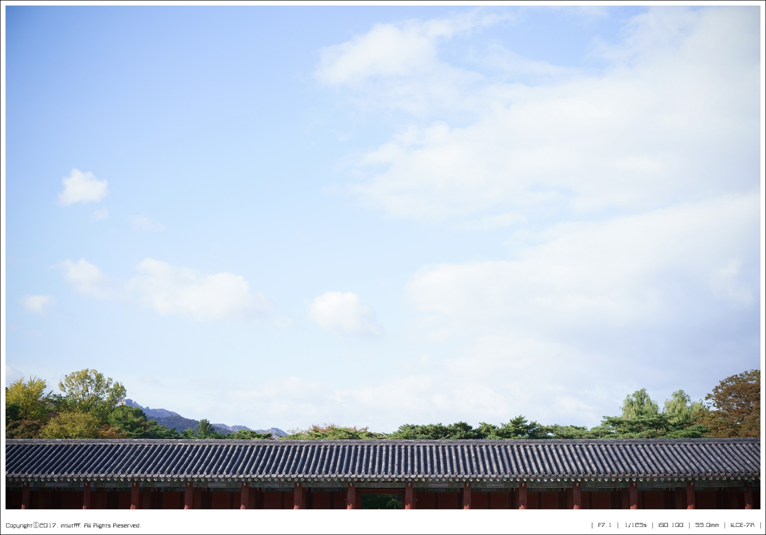 ILCE-7R | Manual | 55.00mm | ISO-100 | F7.1 | 1/125s | 0.00 EV | Centre Weighted Average | Auto WB | 2017-10-22 15:39:26