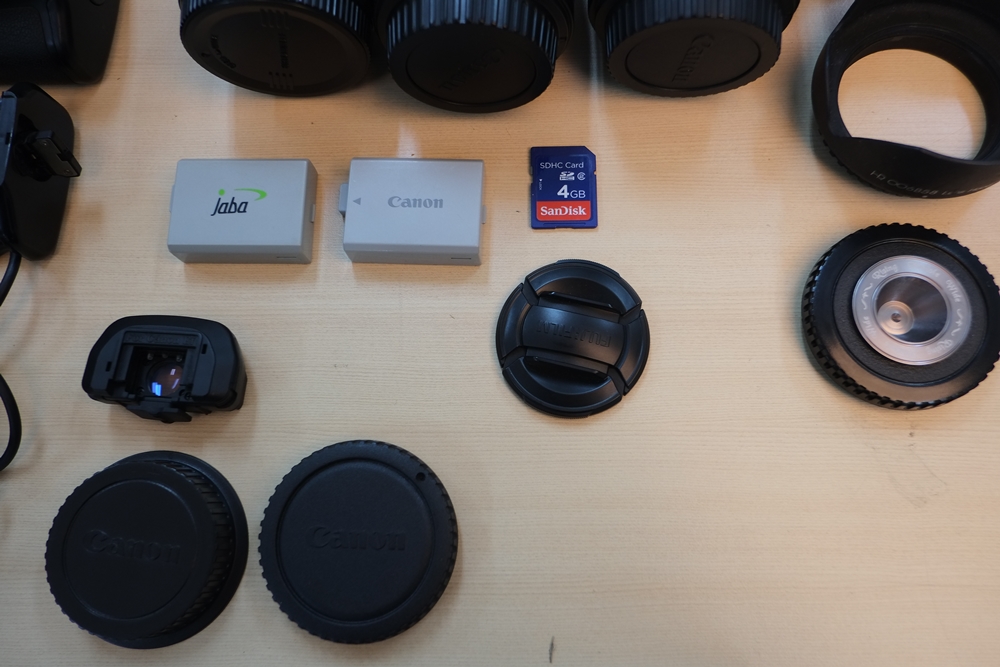 정품배터리 1, 호환배터리1, 데이터케이블, 4gb 메모리, 핀홀렌즈, 스크류타입 호환후드(이건안쓰실듯..), 수평계, 바디 렌즈 모두 앞뒤 캡 전부,  85mm 1.8렌즈 담고다니는(?) 시그마파우치, 스트랩, 캐논 기본카메라 가방 입니다. (사진에 보이는 후지 캡은 아닙니다..ㄷㄷ)