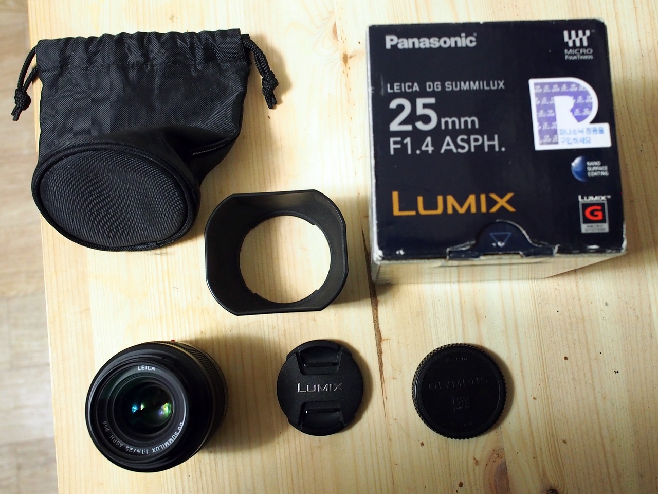 구성품은 렌즈, UV필터, 앞캡, 뒤캡(올림푸스), 순정후드, 파우치, 박스입니다.