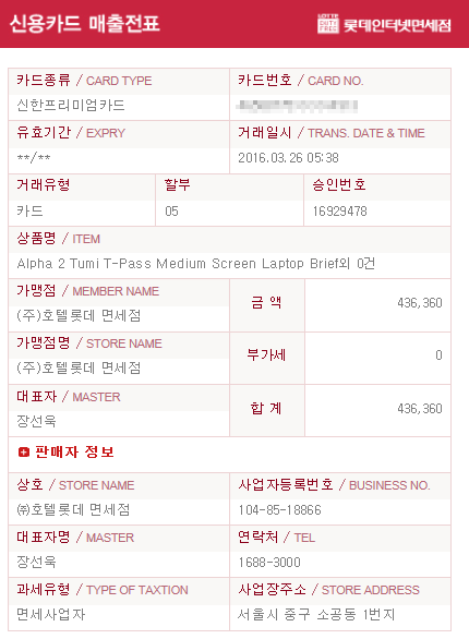 인터넷면세점 구입품은 품질보증서를 영수증으로 대신하니 하나 출력해드리겠습니다.