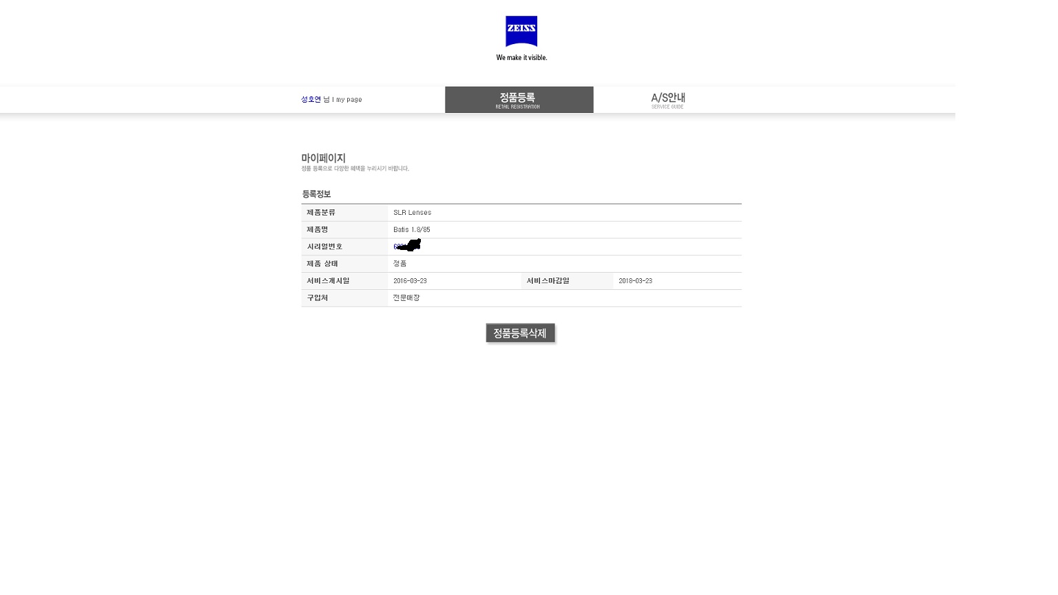 올해 3월 구입하여, 정품등록 무상기간은 2018년03월까지 입니다.