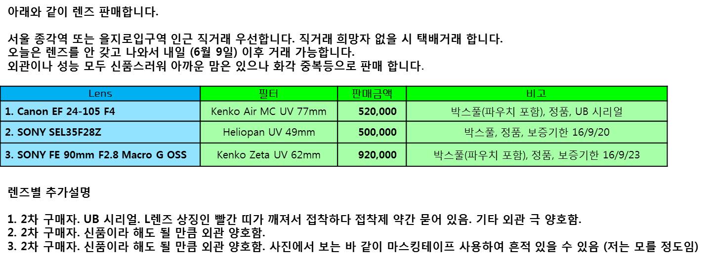 캐논 렌즈는 내일 렌즈구매 여부에 따라 내일 (6월 9일) 오후에 판매여부 재 게시 하겠습니다.