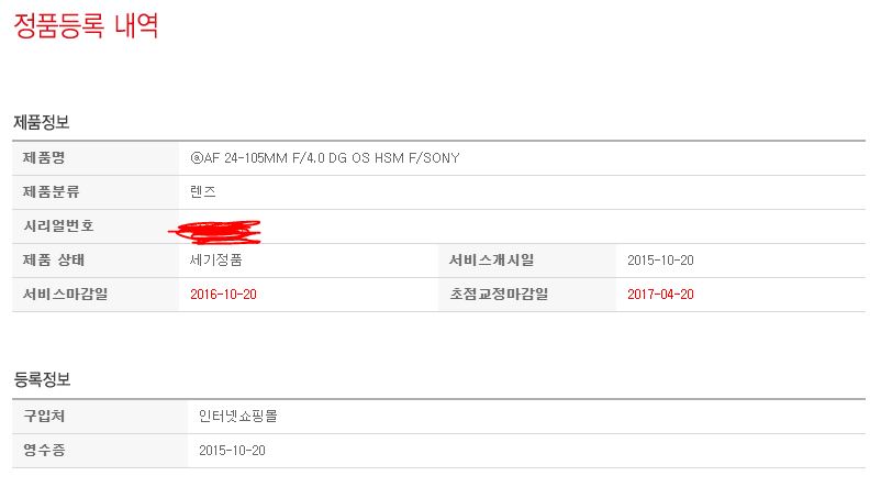보증기간 : 서비스 2016년 10월 20일까지