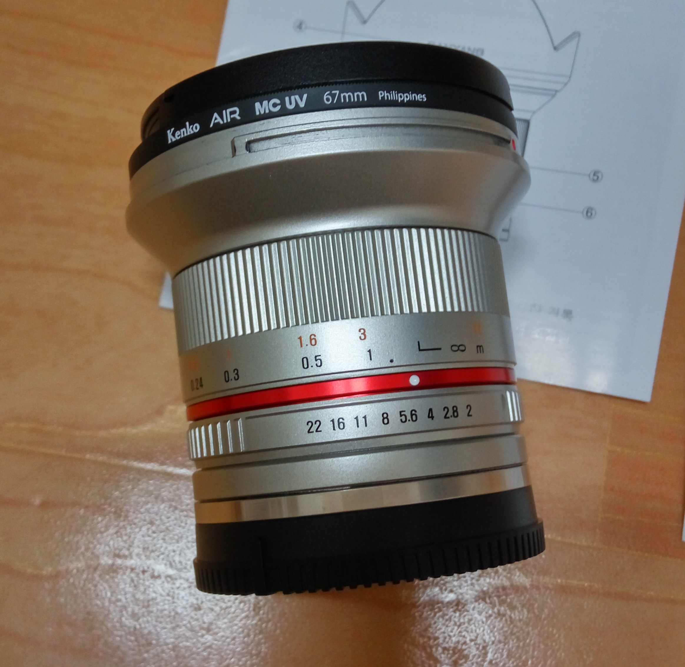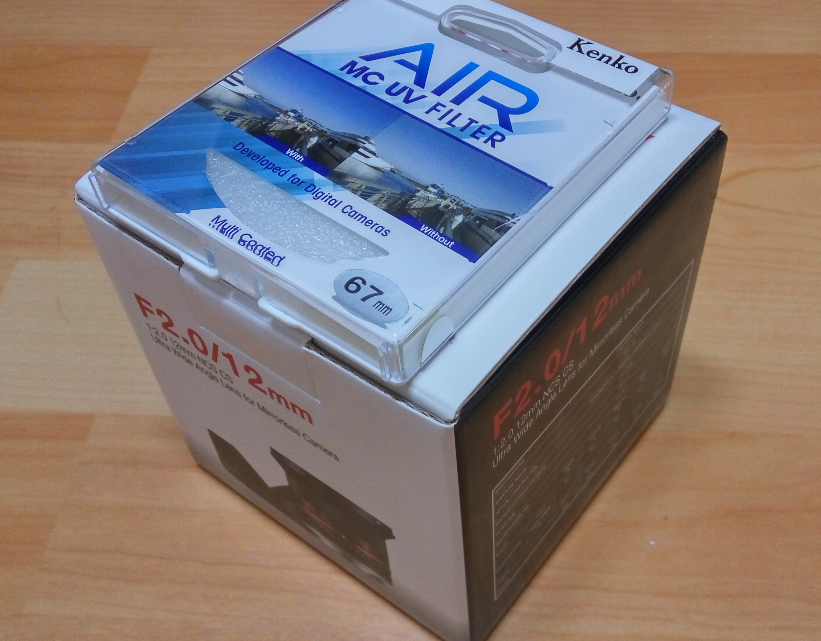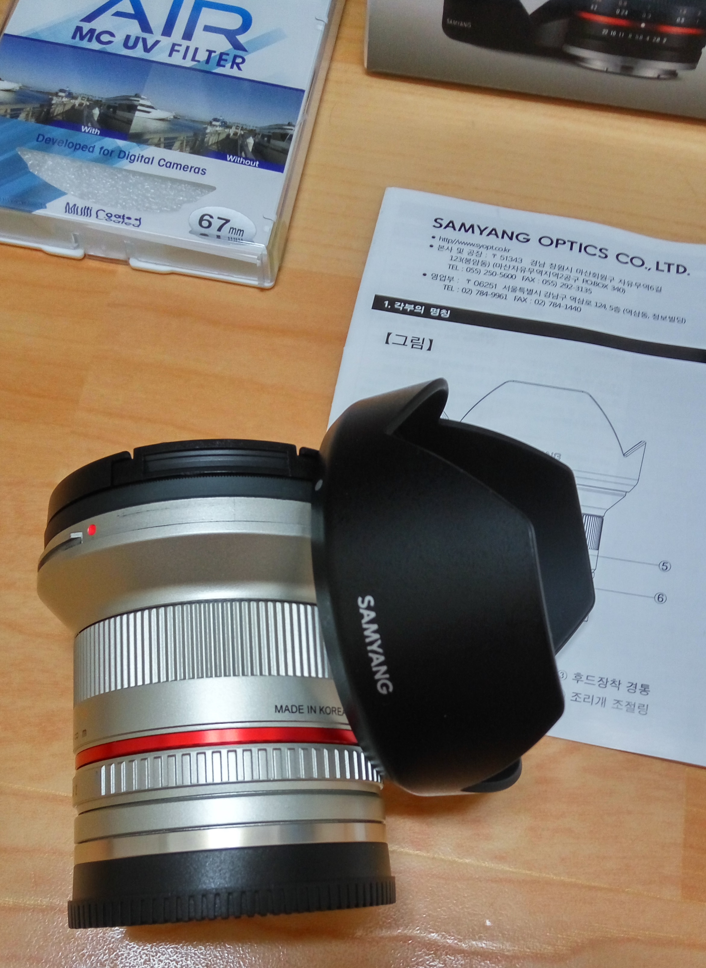구성품은 풀박구성이고 보증서, 파우치, 후드, 렌즈본체, 렌즈앞뒤캡 / 겐코 mcuv필터입니다