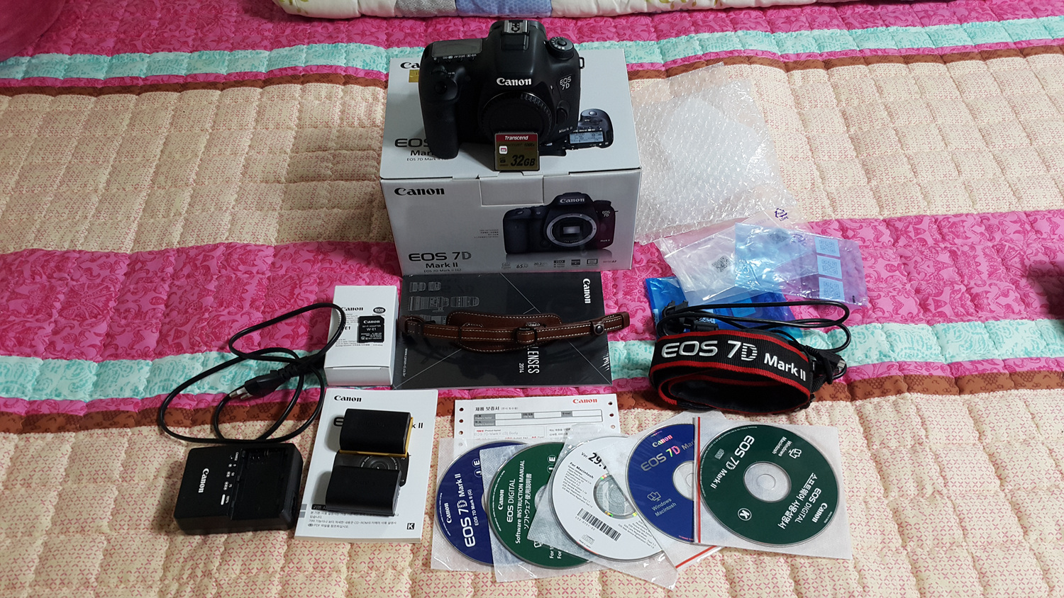 정품베터리(LP-E6) + 추가베터리(LP-E6N) 있으며, 2차 구매후 사용하던 헤링본 핸드스트랩 은 따라갑니다.(삼각대 플레이트에 체결하면서 상태가 좋지 않습니다.;;)