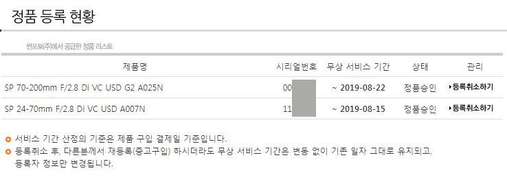 올해 8월에 신품으로 구입한 렌즈이고, 무상서비스 기간 2년이라 2019.8.22 까지 됩니다.
