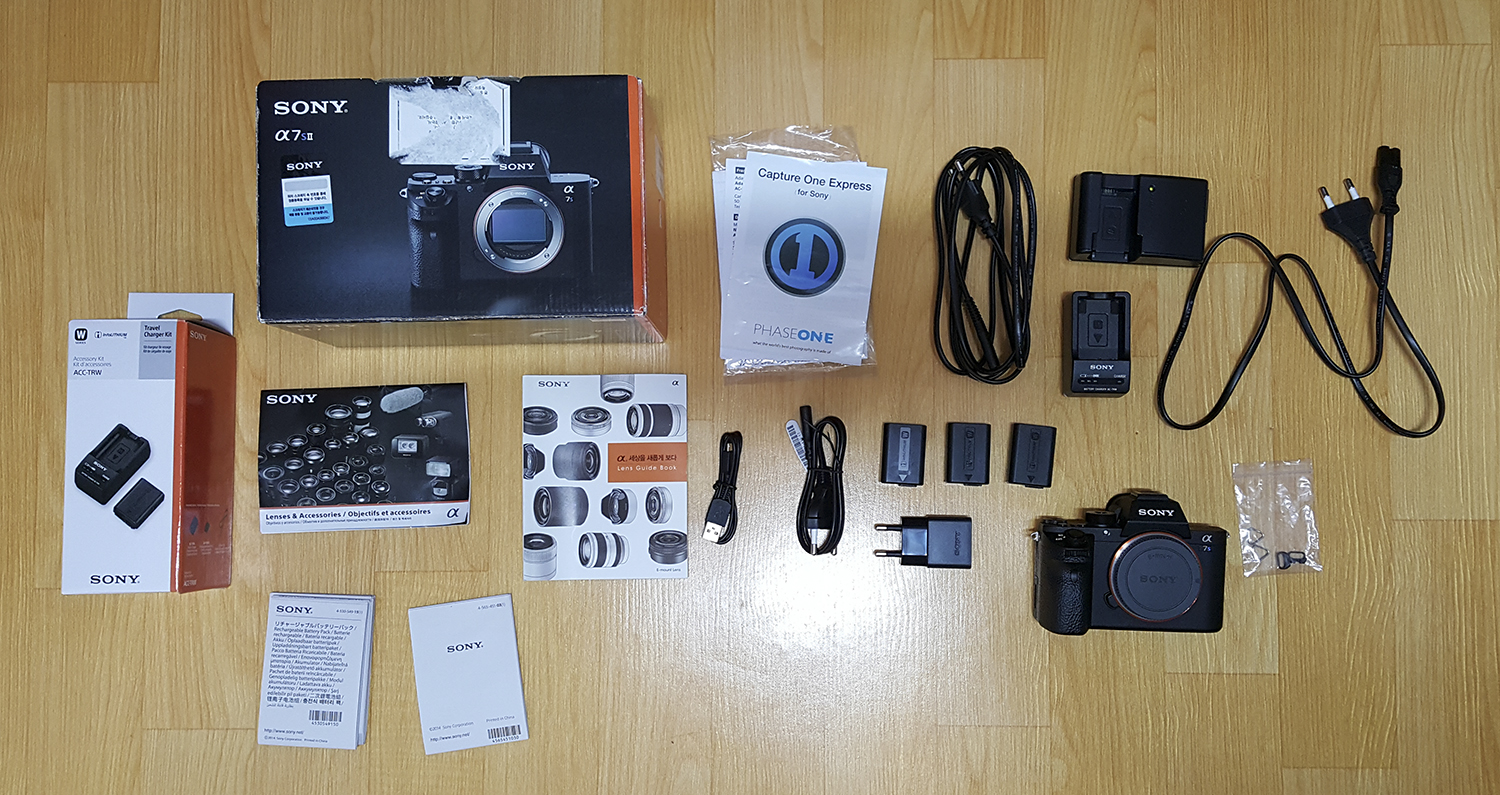a7s2본체, 삼각링, 정품박스, 배터리킷박스, 배터리 3개, 5핀 충전기 1개, 배터리 충전기 2개, 강화유리필름(붙여져있음),