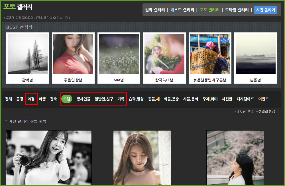 기존의 '풍경' 카테고리에 게재해야만 했던 야경 사진은, 회원분들이 야경 사진을 참고하기 좋도록 별도의 '야경' 카테고리를 신설하여 야경 사진만 따로 볼 수 있도록 했습니다.