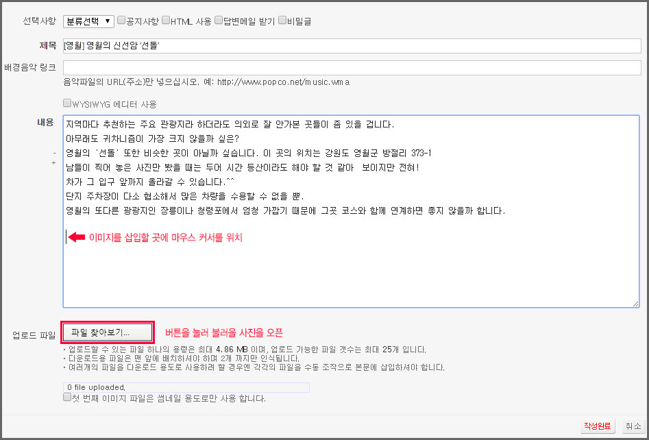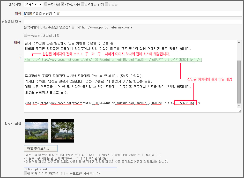 아래는 게시판 사진 등록 방법에 대한 설명입니다. 내용이 다소 길더라도 팝코를 처음 이용하시는 분은 아래 두 가지 방법을 반드시 정독해주세요.