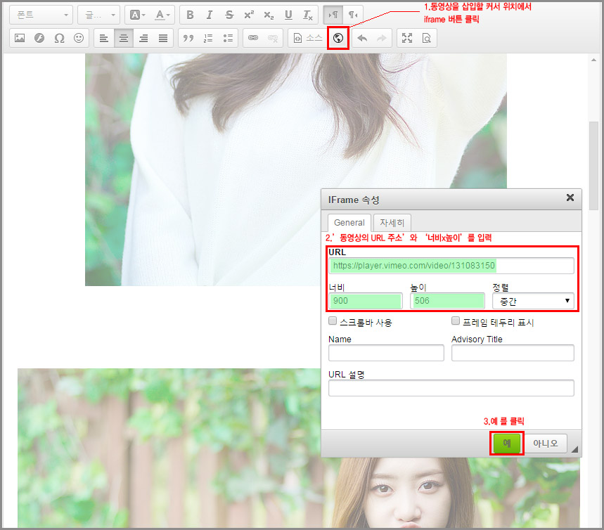 그리고 iframe 속성 창에 위의 유투브나 비메오의 동영상 URL 주소, 그리고 너비x높이 픽셀을 입력, 정렬 등을 선택한 뒤 '예'를 클릭하면 됩니다.
