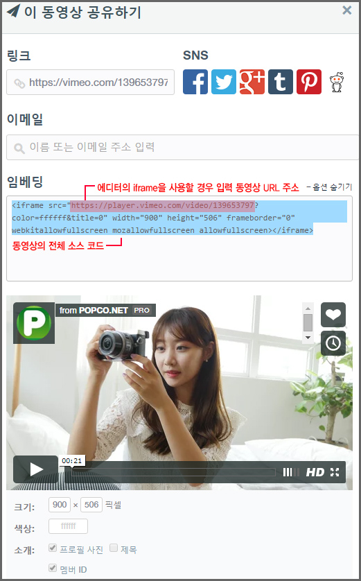 ►C-2-2.비메오의 경우도 비슷합니다. 비메오 또한 iframe 에 들어갈 동영상 URL 주소, 그리고 iframe 에 입력할 가로x세로 픽셀만 있으면 됩니다.
