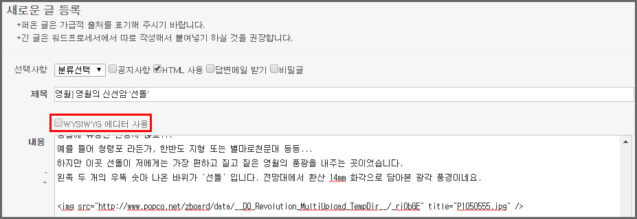 또한 위의 A 방식의 HTML 형식으로 게시물 작성을 마친 후 게시물 등록 전 에디터 사용에 체크를 하게 되면
