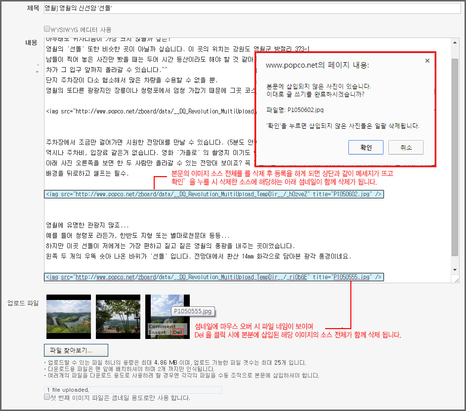 ►A-5. 아래에 임시 첨부된 섬네일 삭제 시 본문에 삽입된 해당 이미지의 소스도 실시간으로 함께 삭제 됩니다.