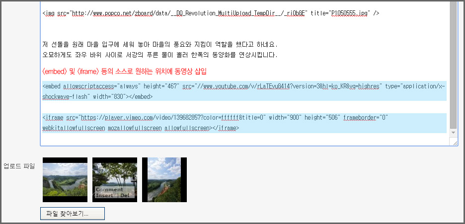 ►A-6. 사진 첨부와 글을 작성하면서 embed, iframe 등의 동영상 소스를 원하는 위치에 삽입할 수 있습니다.