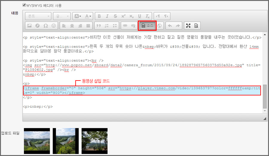 *주의 : 동영상 삽입시 동영상 삽입 소스와 관계 없는 '<div></div>' 등의 소스를 삽입하면 사진 등록이나 게시판 전체에 영향을 줄 수 있습니다.