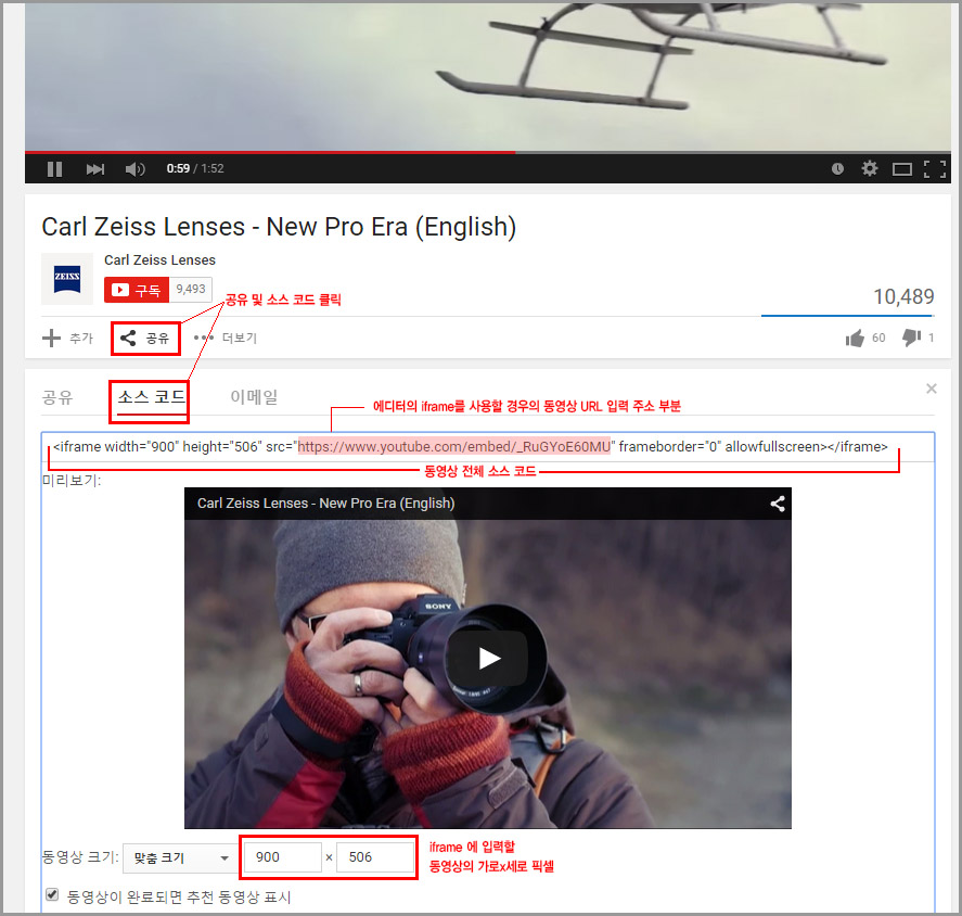 이 때 iframe 에 삽입할 동영상 URL 주소, 그리고 적절한 동영상의 가로x세로 픽셀 만 있으면 됩니다.