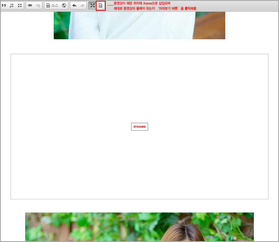 ►C-2-4.아래와 같이 iframe Box로 동영상이 해당 위치에 삽입되면 제대로 플레이가 되는지 미리보기 버튼을 클릭해봅니다.