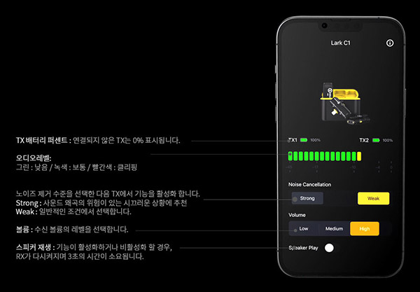 PLAY 스토어 및 APP store를 통해 LARKSOUND를 설치 사용하면 송신기의 배터리 잔량, 오디오 레벨, 노이즈 캔슬링 강도 및 수신기의 음량 수신 강도 등을 설정할 수 있다. 사용자의 다양한 경험과 노하우를 향상시키기 위한 매우 유용한 어플이다.