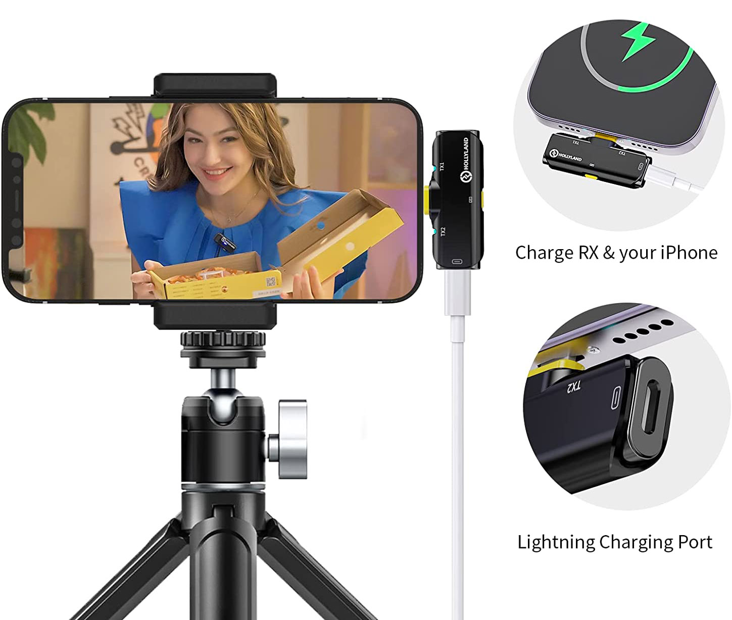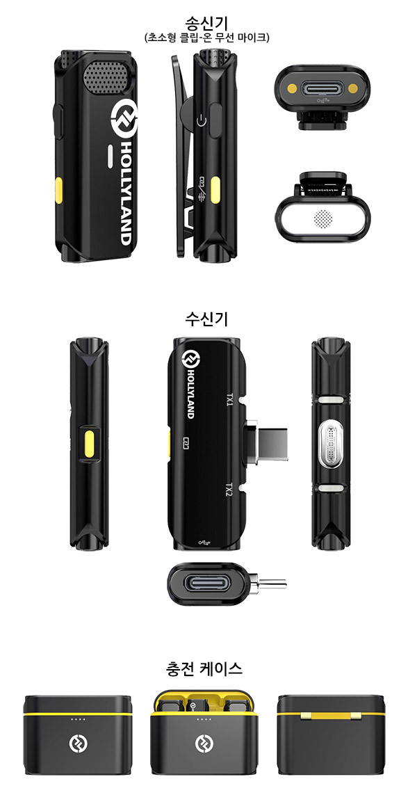 스마트폰이나 태블릿에 연결하는 수신기와 클립 온 무선 마이크(송신기) 한 쌍은 보관 및 충전 기능을 지원하는 충전 케이스를 통해 이동 중 휴대 및 충전이 가능하며 송신기, 충전 케이스 각각 하단에 마련된 USB-C 단자를 통해 개별 충전을 지원한다.