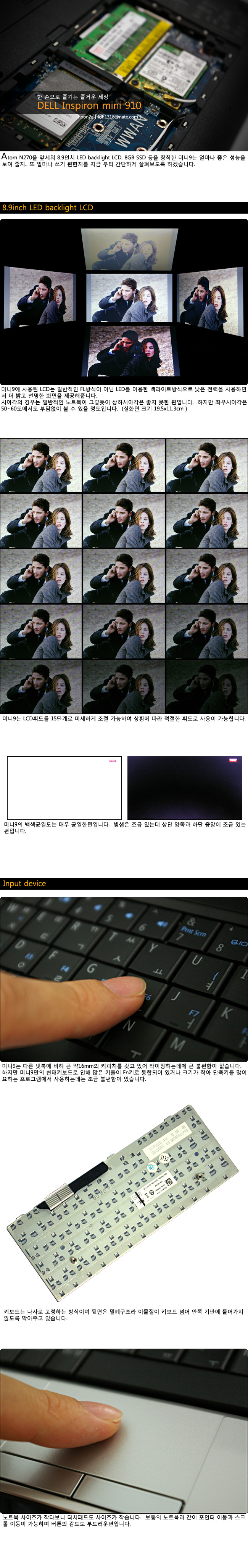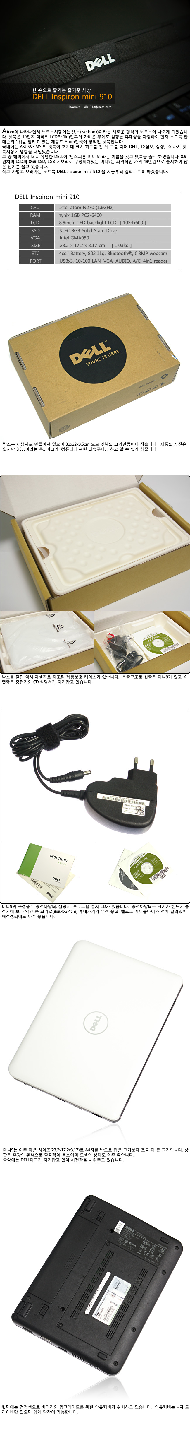 안녕하세요. 최근에 인기가 급상승한 넷북(netbook)... 그 중 델 인스피론 미니9 (DELL inspiron mini 9 )를 구입하게 되었습니다. 작은 크기, 팬리스(무소음), led backlight LCD, SSD, 저렴한 가격이 매력인 미니9를 살펴보도록 하겠습니다. (애칭 미나)