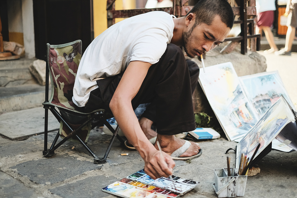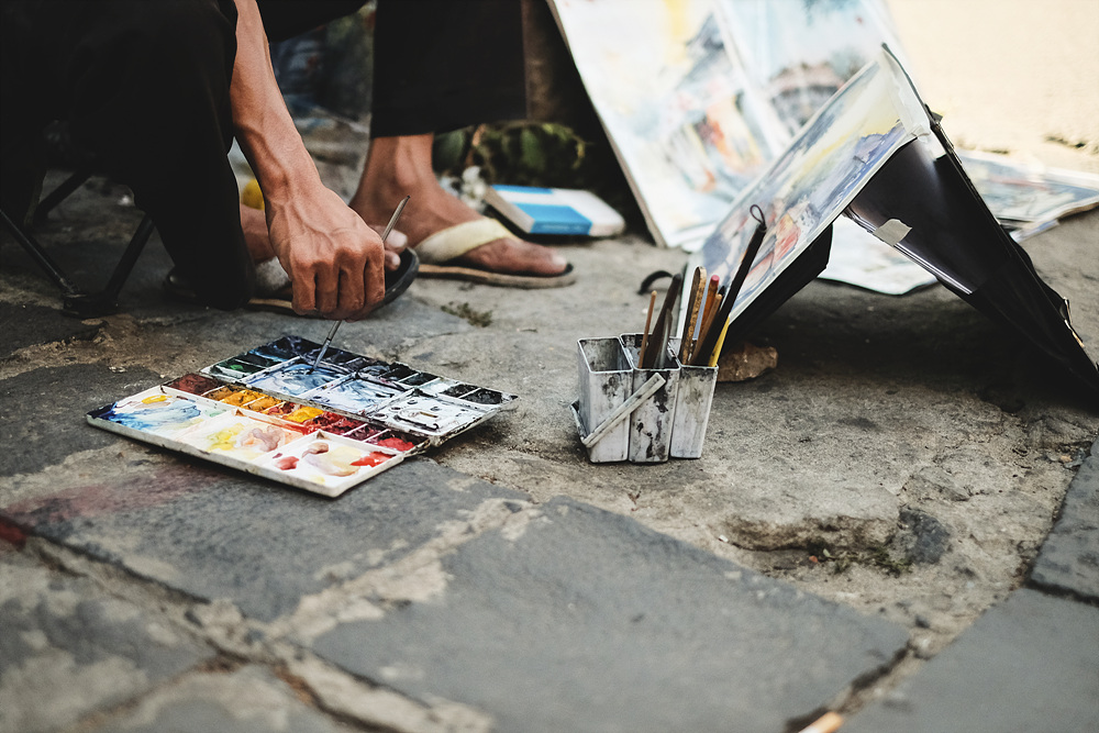 많은 관광객 사이에서 땅바닥에 몸을 구부려 그림을 그리는 거리의 화가